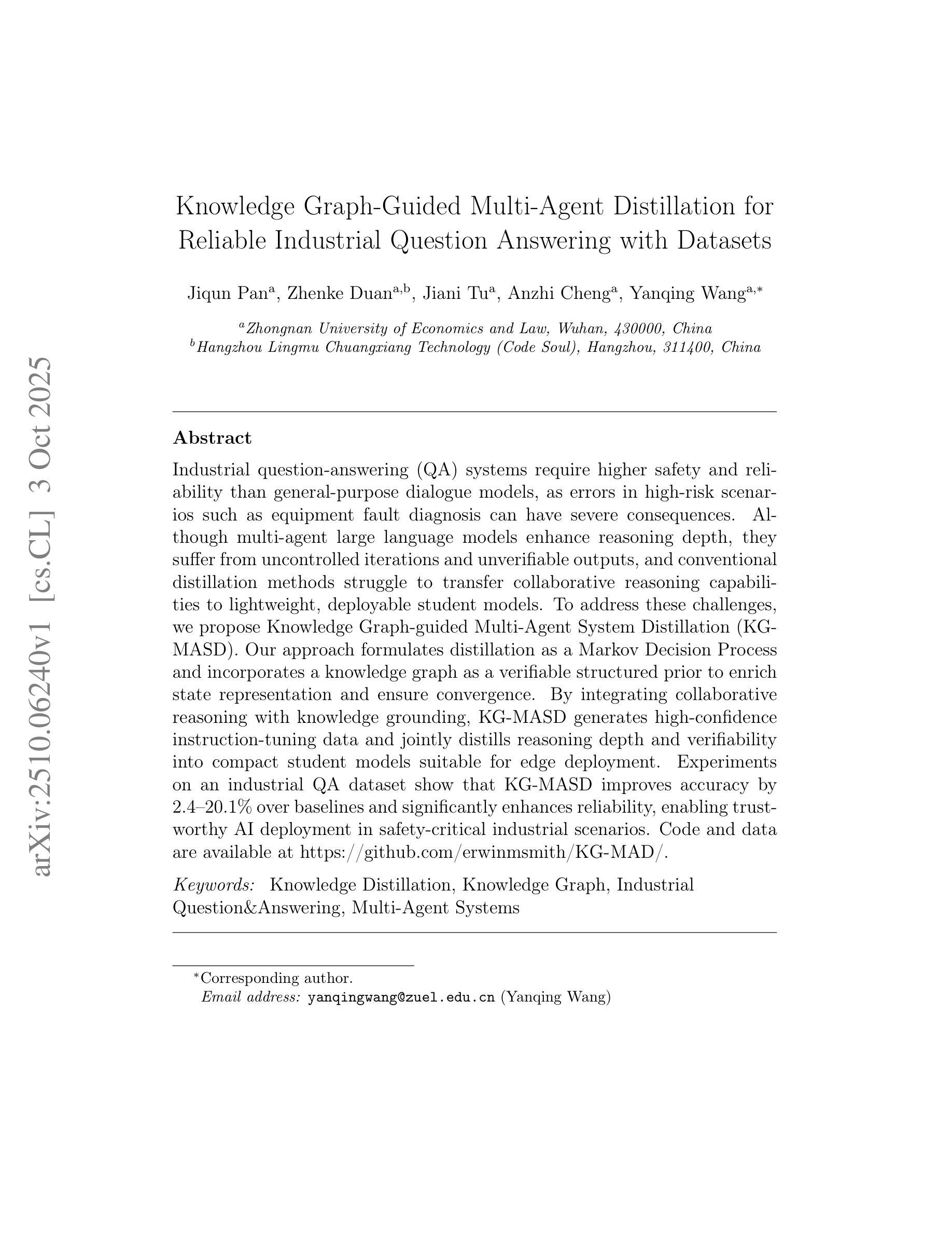 产业问答系统(QA)对安全性和可靠性的要求高于通用对话模型,因为在设备故障诊断等高风险场景中出错会产生严重后果。虽然多智能体大型语言模型增强了推理深度,但它们存在不可控迭代和不可验证输出的问题,传统蒸馏方法难以将协作推理能力转移到轻量级、可部署的学生模型。为了应对这些挑战,我们提出了知识图谱引导的多智能体系统蒸馏(KG-MASD)。我们的方法将蒸馏公式化为马尔可夫决策过程,并融合知识图谱作为可验证的结构化先验来丰富状态表示并确保收敛。通过结合协作推理和知识接地,KG-MASD生成高置信度指令调整数据,并将推理深度和可验证性联合蒸馏成适用于边缘部署的紧凑学生模型。在工业QA数据集上的实验表明,与基线相比,KG-MASD的准确率提高了2.4%至20.1%,并显著提高了可靠性,可在安全关键工业场景中实现可信AI部署。代码和数据集可通过https://github.com/erwinmsmith/KG-MAD/获取。