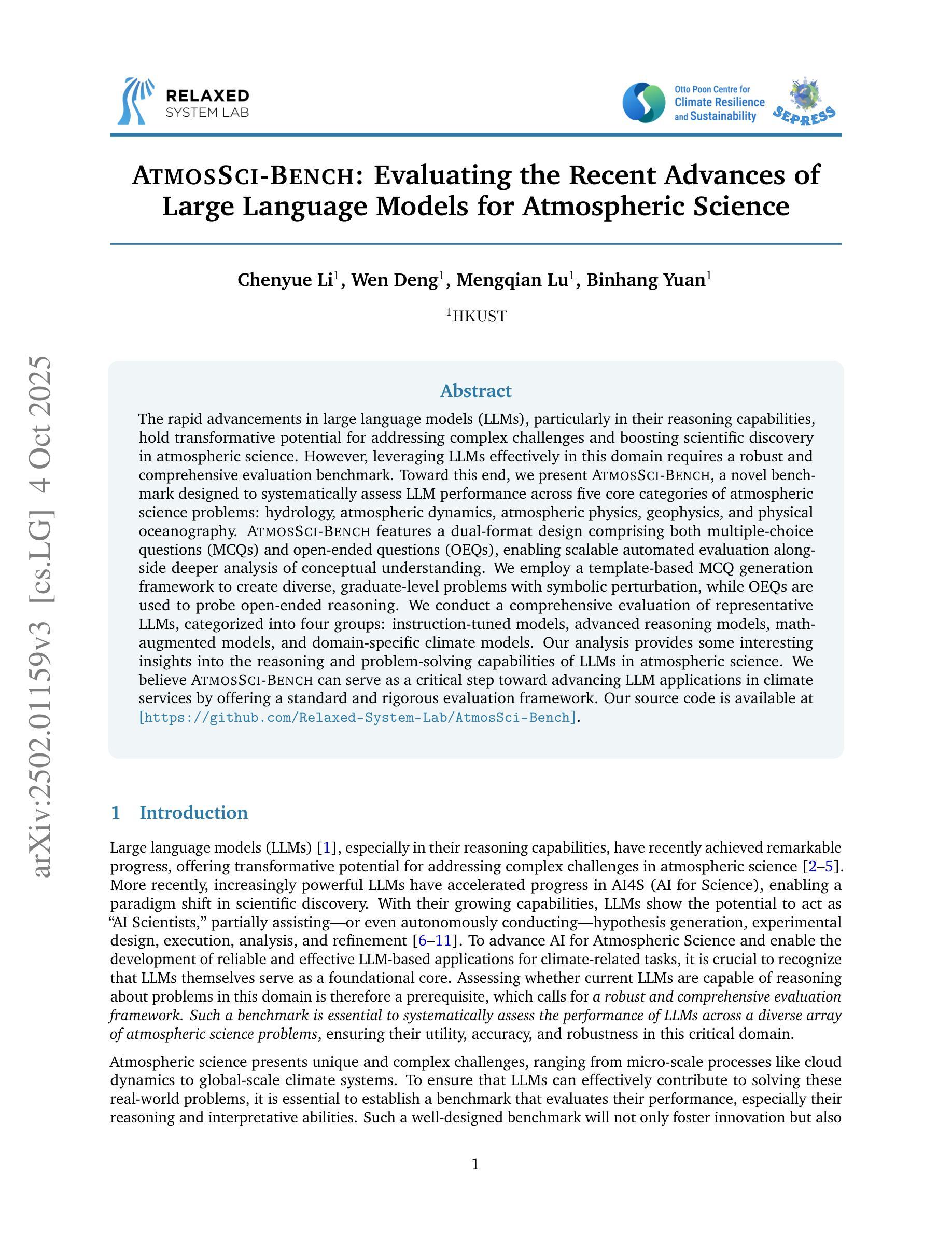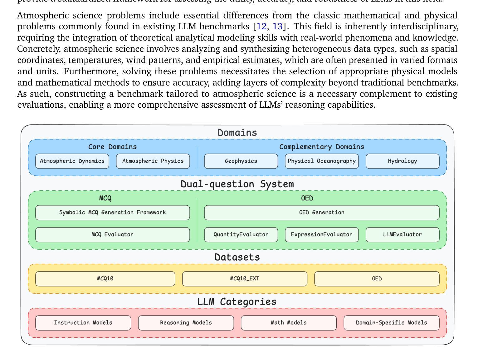 - AtmosSci-Bench是一个新的基准测试,旨在评估LLM在五个大气科学核心领域的问题解决能力。