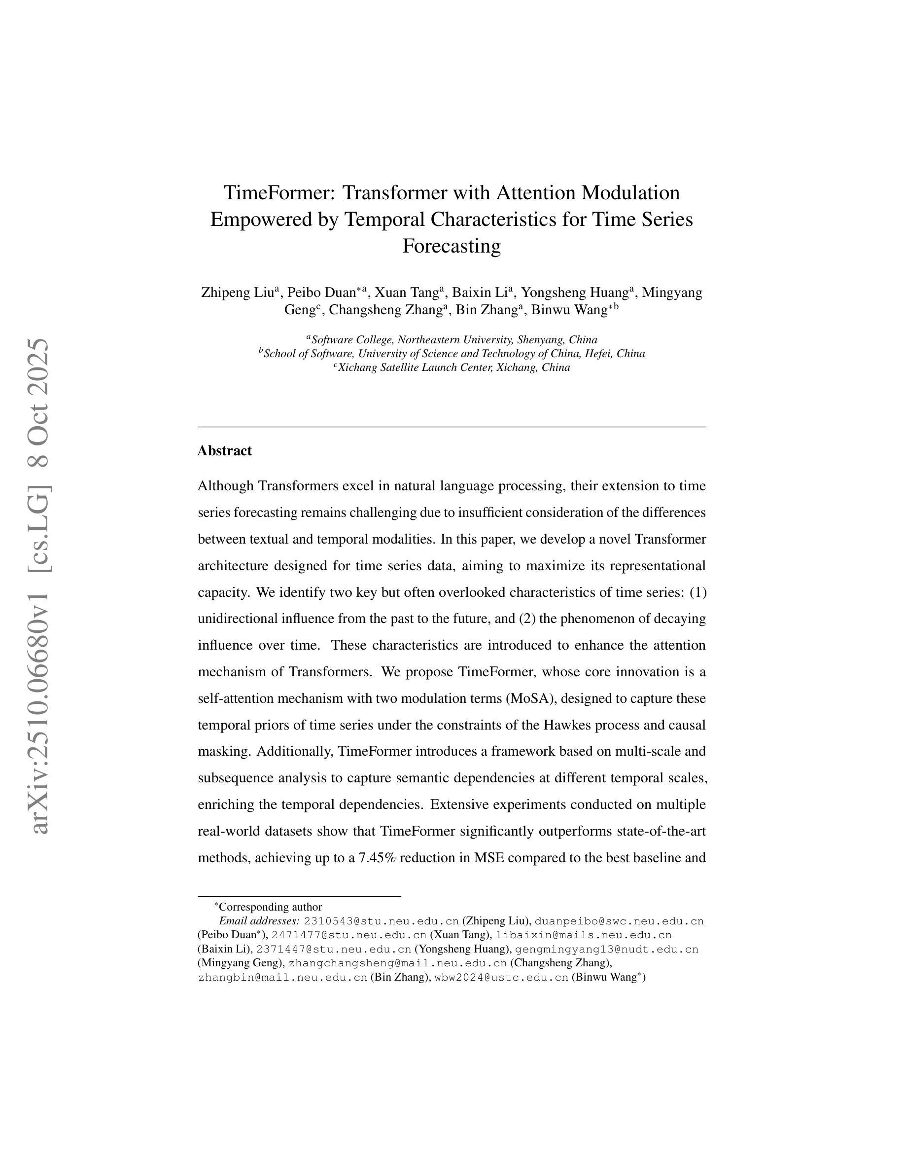 尽管Transformer在自然语言处理方面表现出色,但由于未能充分考虑到文本和时间模态之间的差异,将其应用于时间序列预测仍然具有挑战性。在本文中,我们开发了一种针对时间序列数据的新型Transformer架构,旨在最大限度地提高其表示能力。我们确定了时间序列的两个关键但常被忽视的特征:(1)过去对未来单向影响;(2)随时间流逝影响衰减的现象。这些特性被引入到增强Transformer的注意力机制中。我们提出了TimeFormer,其核心创新点是一种带有两个调制项(MoSA)的自注意力机制,旨在在满足霍克斯过程和因果掩码约束的条件下,捕捉这些时间序列的时间先验信息。此外,TimeFormer还引入了一个基于多尺度和子序列分析的框架,以捕获不同时间尺度上的语义依赖关系,丰富时间依赖性。在多个真实世界数据集上进行的广泛实验表明,TimeFormer显著优于最新方法,在均方误差(MSE)方面相比最佳基线降低了高达7.45%,在评价指标上达到了94.04%的新基准。此外,我们证明了MoSA机制可以广泛应用于提高其他基于Transformer的模型性能。