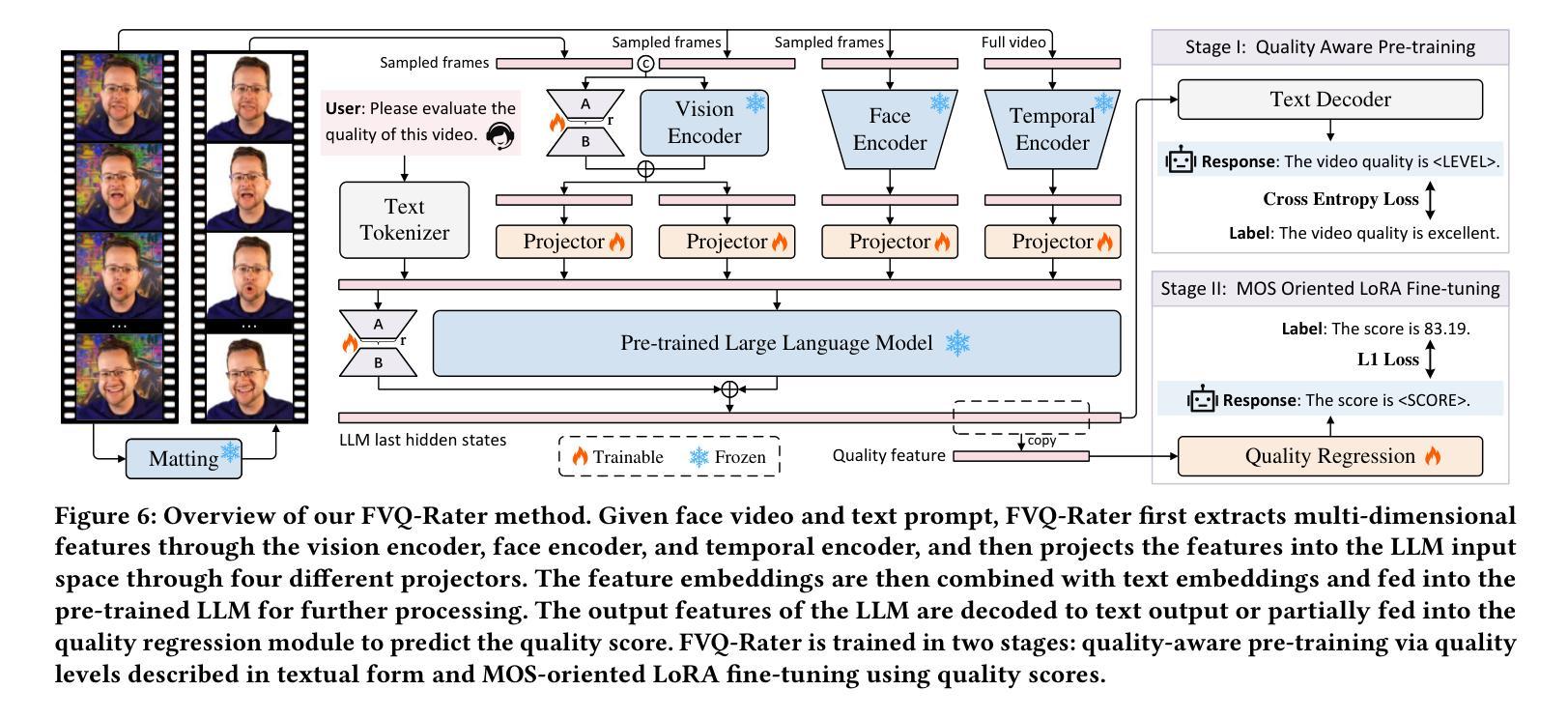 脸部视频质量评估(FVQA)除了通用视频质量评估(VQA)外,值得进一步探索。脸部视频是社交媒体平台的主要内容,而人眼视觉系统对人脸尤为敏感。然而,由于缺乏大规模的FVQA数据集,FVQA的研究很少。为了填补这一空白,我们首次推出了大规模的野生FVQA数据集FVQ-20K,它包含2万段野生脸部视频以及相应的平均意见得分(MOS)注释。除了FVQ-20K数据集外,我们还提出了一种专门的FVQA方法,名为FVQ-Rater,实现对人脸视频的拟人评分,这是首次探索大型多模态模型(LMMs)在FVQA任务中的潜力。具体来说,我们精心提取了包括空间特征、时间特征和面部特定特征(即肖像特征和面部嵌入)在内的多维特征,以提供全面的视觉信息,并利用基于LoRA的指令调整技术实现质量特定的微调,这在FVQ-20K和CFVQA数据集上都表现出卓越的性能。大量的实验和综合分析证明了FVQ-20K数据集和FVQ-Rater方法在推动FVQA发展中的显著潜力。