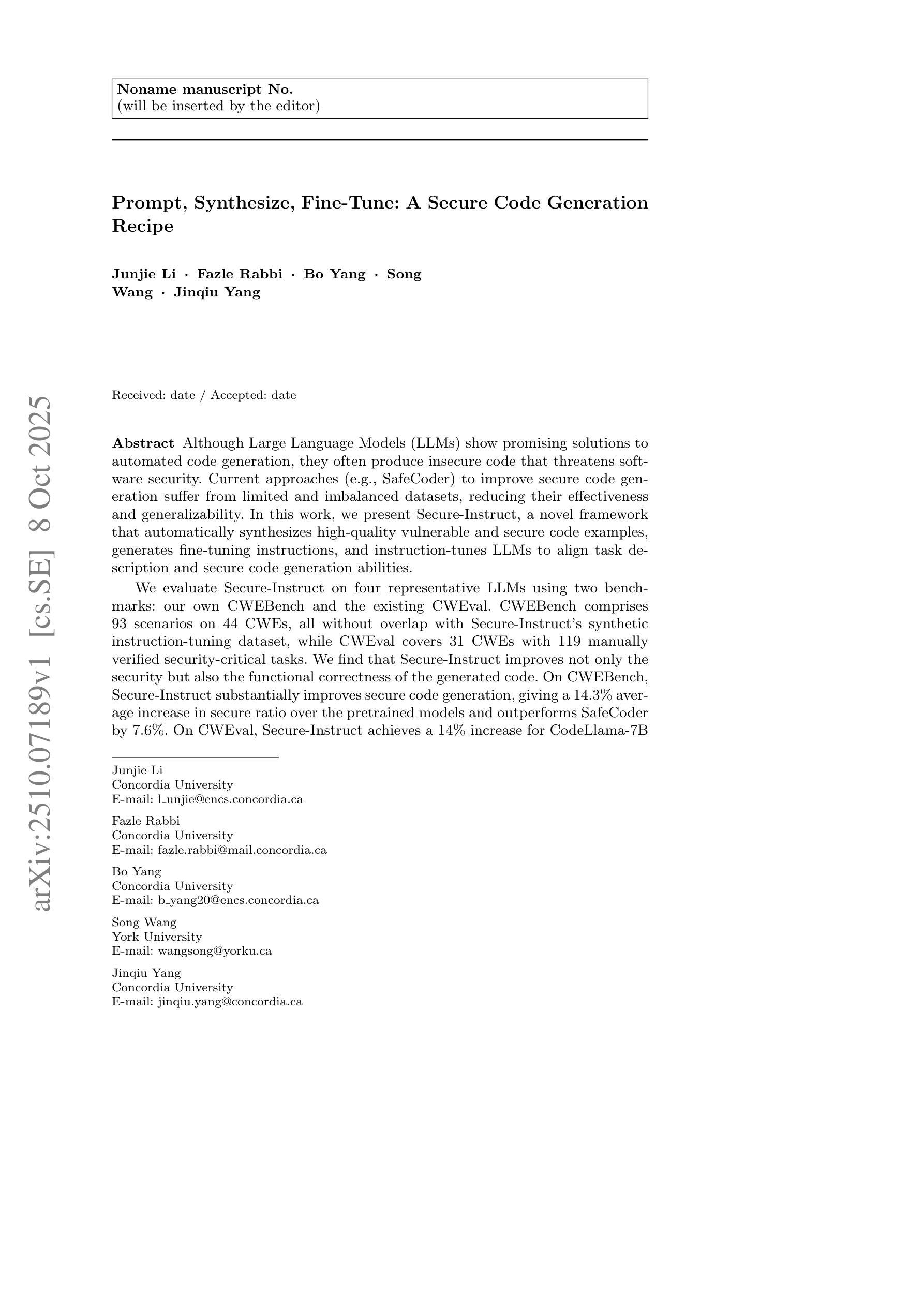 Although Large Language Models (LLMs) show promising solutions to automated code generation, they often produce insecure code that threatens software security. Current approaches (e.g., SafeCoder) to improve secure code generation suffer from limited and imbalanced datasets, reducing their effectiveness and generalizability. In this work, we present Secure-Instruct, a novel framework that automatically synthesizes high-quality vulnerable and secure code examples, generates fine-tuning instructions, and instruction-tunes LLMs to align task description and secure code generation abilities. We evaluate Secure-Instruct on four representative LLMs using two benchmarks: our own CWEBench and the existing CWEval. CWEBench comprises 93 scenarios on 44 CWEs, all without overlap with Secure-Instruct’s synthetic instruction-tuning dataset, while CWEval covers 31 CWEs with 119 manually verified security-critical tasks. We find that Secure-Instruct improves not only the security but also the functional correctness of the generated code. On CWEBench, Secure-Instruct substantially improves secure code generation, giving a 14.3% average increase in secure ratio over the pretrained models and outperforms SafeCoder by 7.6%. On CWEval, Secure-Instruct achieves a 14% increase for CodeLlama-7B and 5.8% for Mistral-7B in Func-Sec@1 over pretrained models, and surpasses SafeCoder by 15.8% and 6.8% respectively.