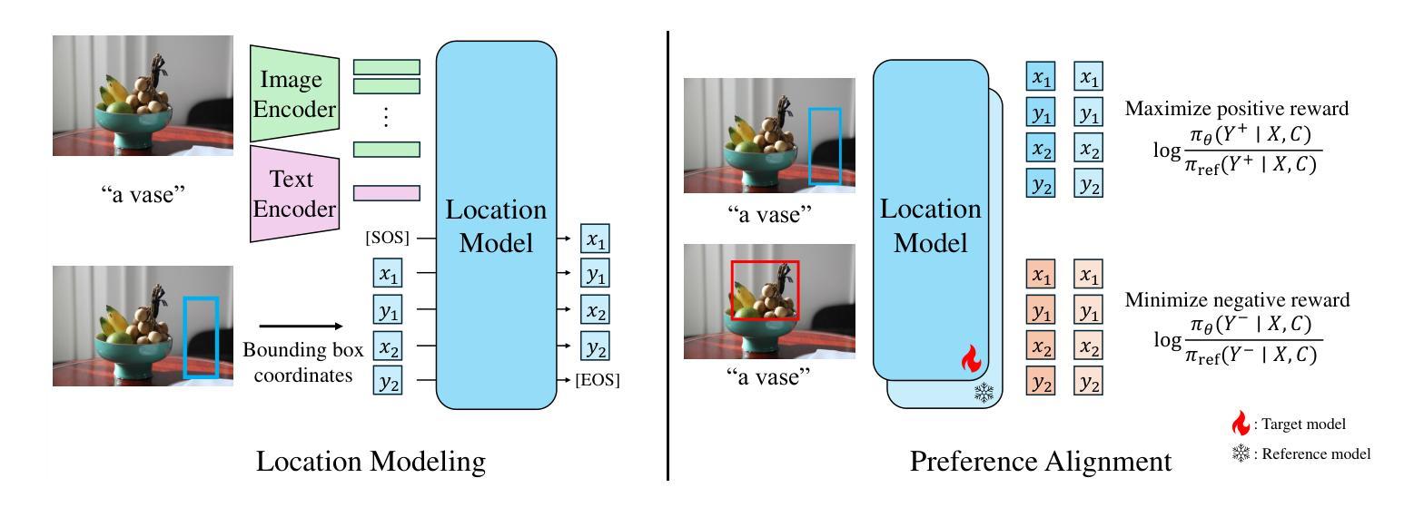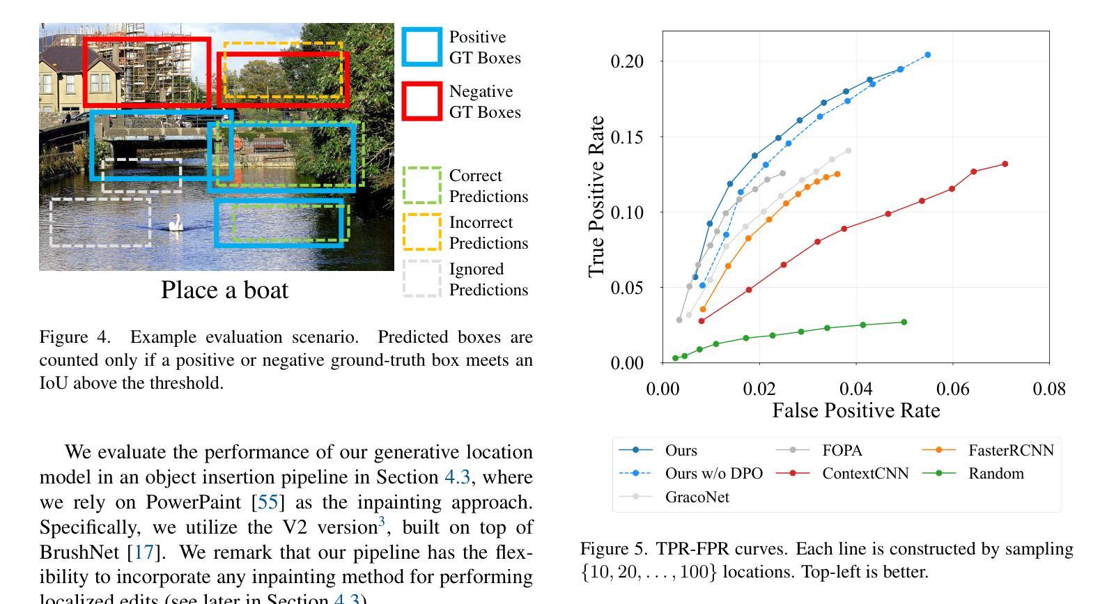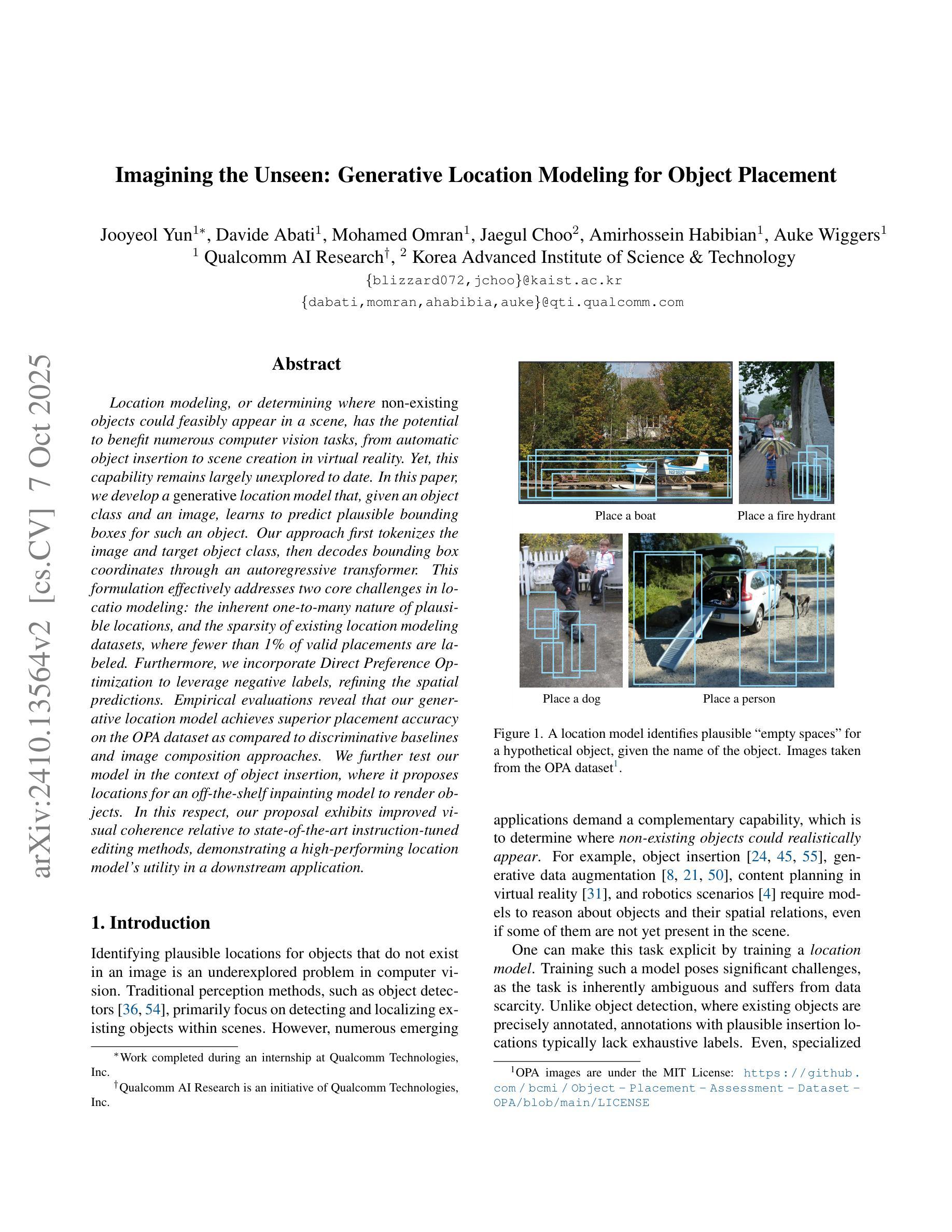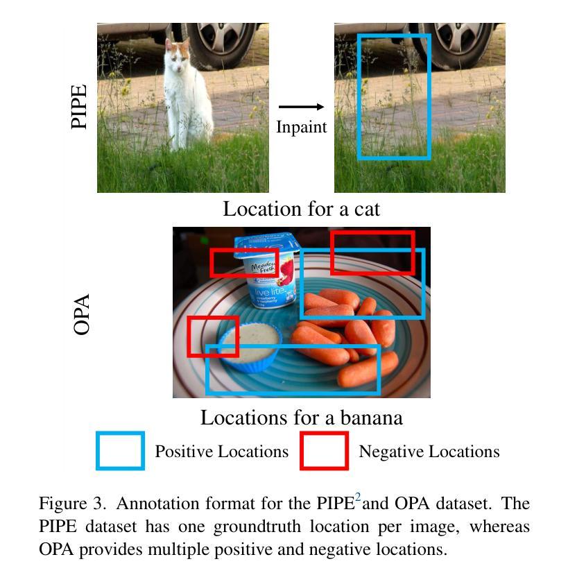 位置建模,或者确定场景中不存在的物体可能出现的位置,具有为众多计算机视觉任务带来潜在益处的潜力,从自动物体插入到虚拟现实场景创建。然而,这种能力至今尚未得到充分的探索。在本文中,我们开发了一种生成式位置模型,该模型在给定的目标对象和图像的情况下,能够预测该对象的合理边界框。我们的方法首先对图像和目标对象类别进行标记化,然后通过自回归变压器解码边界框坐标。这种表述有效地解决了位置建模中的两个核心挑战:合理位置的固有的一到多对应关系,以及现有位置建模数据集稀疏的问题,其中只有不到1%的有效位置被标记。此外,我们结合了直接偏好优化来利用负面标签,对空间预测进行细化。经验评估表明,我们的生成位置模型在OPA数据集上的放置精度优于判别基准和图像组合方法。我们进一步在物体插入的上下文中测试了我们的模型,它为现成的图像修复模型呈现物体位置建议。在这方面,我们的提案与最新的指令调整编辑方法相比,表现出更高的视觉连贯性,证明了高性能位置模型在下游应用中的实用性。