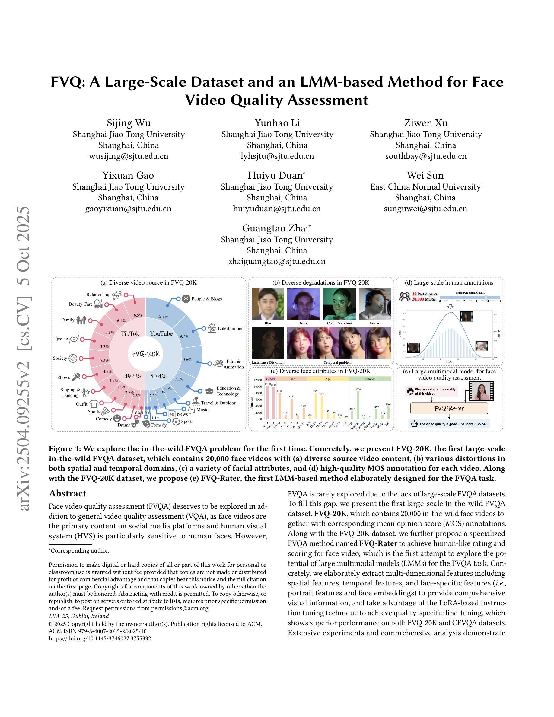 除了通用视频质量评估(VQA),针对脸部视频的评估(FVQA)也值得研究。脸部视频是社交媒体平台的主要内容,且人类视觉系统对人脸特别敏感。然而,FVQA的研究因缺乏大规模数据集而受到限制。为此,我们推出了首个大规模野外FVQA数据集FVQ-20K,包含20,000个野外脸部视频及其对应的平均意见得分(MOS)注释。我们还提出了一种专门的FVQA方法FVQ-Rater,实现对脸部视频的人类式评分,这是首次探索大型多模态模型(LMMs)在FVQA任务中的潜力。我们精心提取了包括空间特征、时间特征和面部特定特征在内的多维特征,利用LoRA基于指令的微调技术实现质量特定的精细调整,在FVQ-20K和CFVQA数据集上表现出卓越的性能。