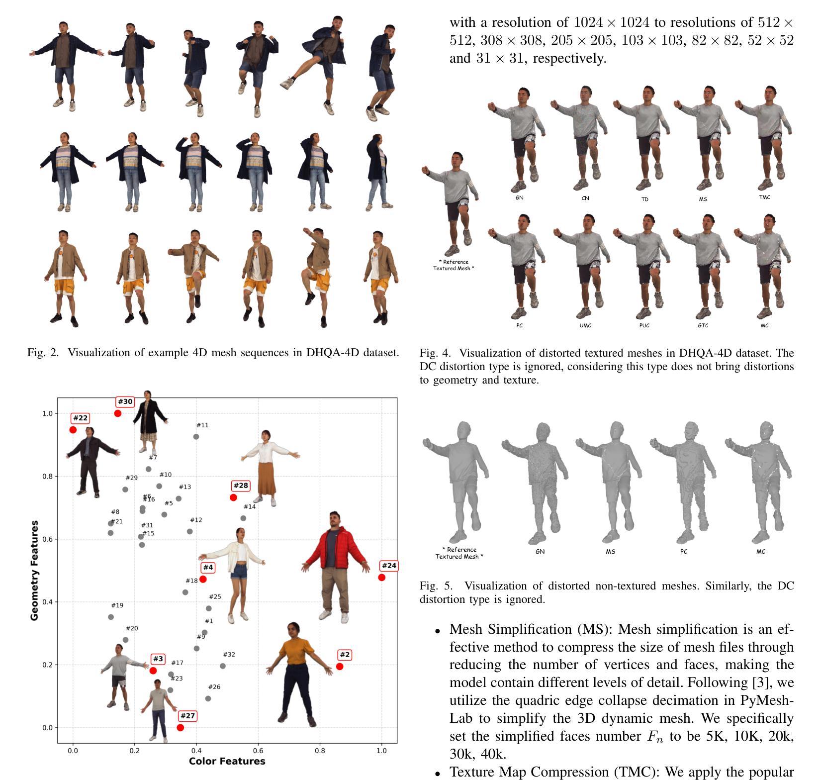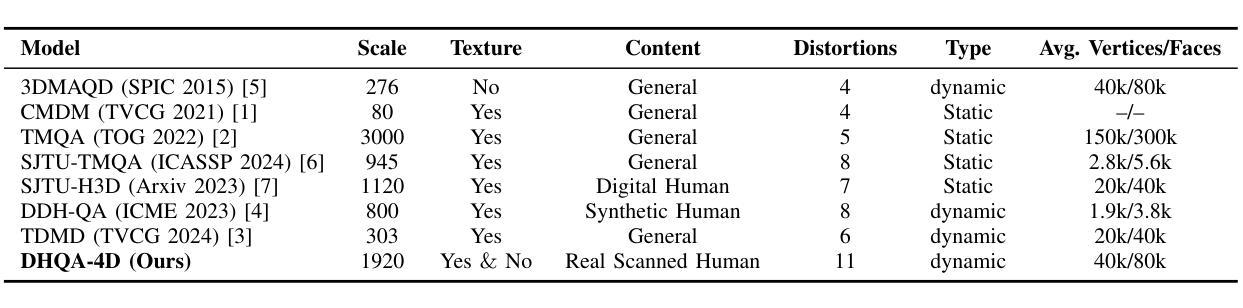 - DHQA-4D数据集包含各种高质量和失真纹理的4D人类网格序列及其对应的平均意见得分(MOSs),用于分析不同类型失真对感知的影响。