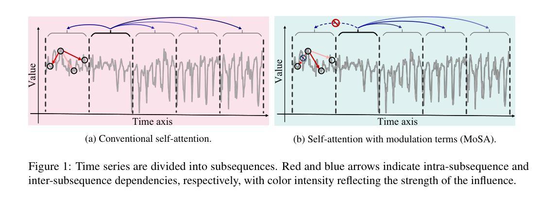 虽然Transformer在自然语言处理方面表现出色,但在时间序列预测方面的应用仍然具有挑战性,因为未能充分考虑文本和时间模态之间的差异。本文提出了一种针对时间序列数据的新型Transformer架构,旨在提高其表示能力。文章强调了时间序列的两个关键但常被忽视的特性:过去对未来单向影响以及影响随时间衰减的现象。为此,文章提出了TimeFormer,其核心创新在于设计了一种带有两个调制项的自注意力机制(MoSA),能够在霍克斯过程和因果掩码的约束下捕捉这些时间先验知识。此外,TimeFormer还引入了一个基于多尺度和子序列分析的框架,以在不同的时间尺度上捕捉语义依赖关系,丰富时间依赖性。在多个真实数据集上进行的广泛实验表明,TimeFormer显著优于最新方法,在均方误差上最多减少7.45%,并在94.04%的评估指标上达到新的基准水平。此外,我们还证明了MoSA机制可以广泛应用于提高其他基于Transformer的模型性能。