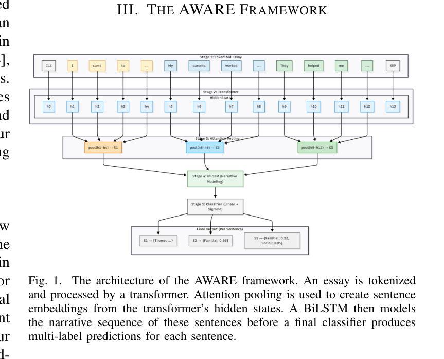 在学生的反思中识别文化资本(CC)主题,可以提供有价值的见解,有助于培养课堂中的公平学习环境。然而,诸如志向目标或家庭支持等主题通常被编织成叙事,而非以关键词的形式直接出现,这使得它们难以被标准的NLP模型检测,这些模型孤立地处理句子。核心挑战源于缺乏意识,因为标准模型是在一般语料库上进行预训练的,这使得它们对数据的特定领域语言和叙事上下文一无所知。为了解决这一问题,我们引入了AWARE框架,该框架系统地尝试提高转换器模型对此类细微任务的意识。AWARE有三个核心组件:1)领域意识,使模型的词汇适应学生反思的语言风格;2)语境意识,生成句子嵌入,意识到整篇文章的语境;3)类别重叠意识,采用多标签策略来识别单个句子中共存的主题。我们的结果表明,通过使模型明确意识到输入的特性,AWARE在Macro-F1上超出了强基线2.1个百分点,并在所有主题上都显示出可观的改进。这项工作为任何依赖于叙事上下文的文本分类任务提供了稳健且可推广的方法。
