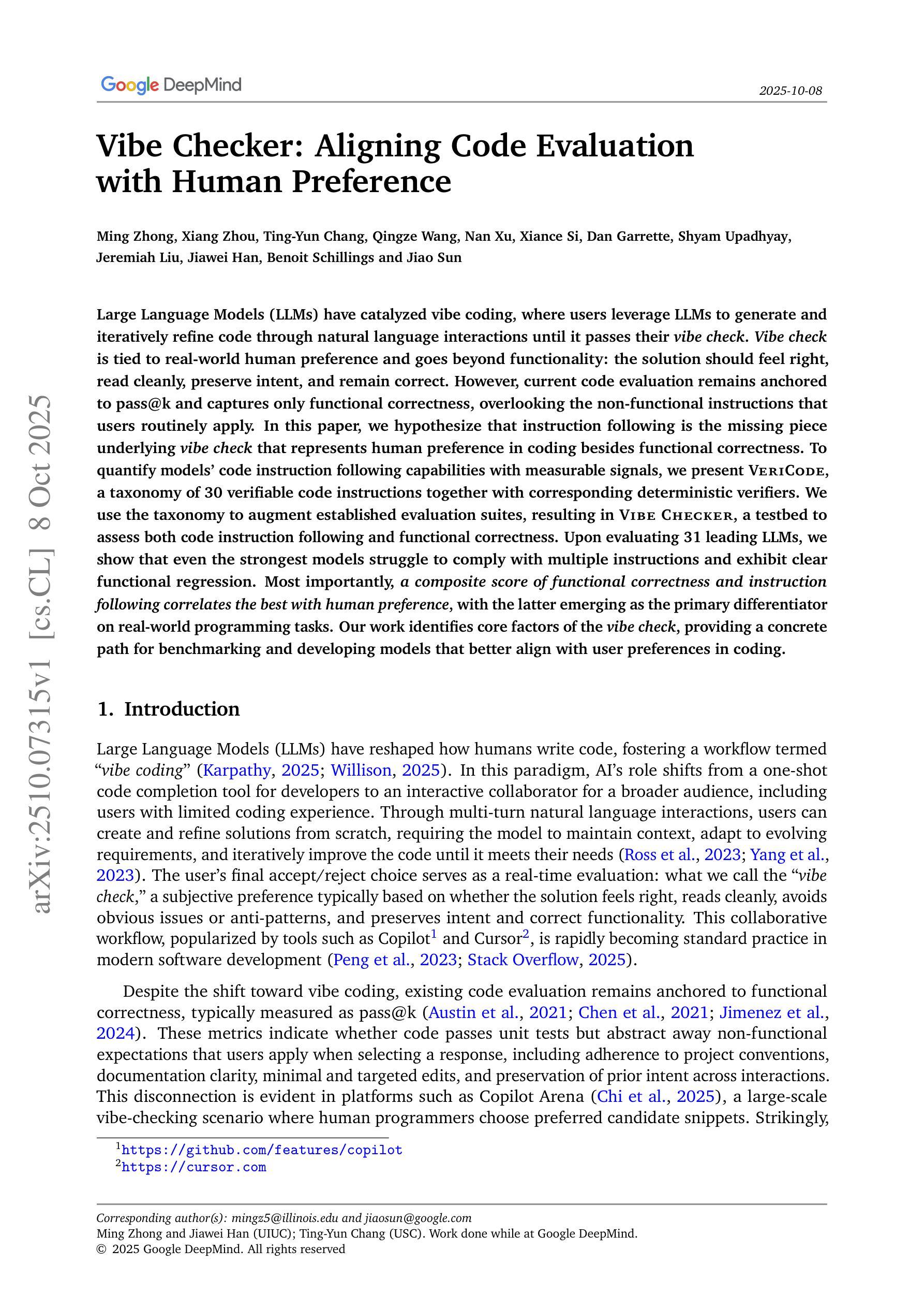 大规模语言模型(LLM)已经推动了氛围编码的发展,用户利用LLM生成代码并借助自然语言交互进行迭代优化,直到通过他们的氛围检查。氛围检查与真实世界的用户偏好有关,并且超越了功能范围:解决方案不仅要能够正确运行,而且要结构清晰、保持意图并且始终正确。然而,当前的代码评估仍然侧重于准确抓住用户意图的前k个选项,仅关注功能正确性,忽视了用户经常应用的非功能性指令。在本文中,我们假设指令遵循是氛围检查中缺失的部分,除了功能正确性外,它代表了人类在编码过程中的偏好。为了量化模型遵循代码指令的能力并使用可测量的信号进行评估,我们提出了VeriCode,这是一个包含30个可验证代码指令的目录,并配备了相应的确定性验证器。我们使用目录来增强现有的评估套件,从而形成了Vibe Checker,一个可以评估代码指令遵循和功能正确性的测试平台。在对31个领先的大型语言模型进行评估后,我们发现即使是最强大的模型也很难遵循多个指令,并且会出现明显的功能回归。最重要的是,功能正确性和指令遵循的组合分数与人类的偏好关联度最高,后者在实际编程任务中成为主要区别因素。我们的工作确定了氛围检查的核心因素,为基准测试和研发更符合用户编码偏好的模型提供了具体路径。