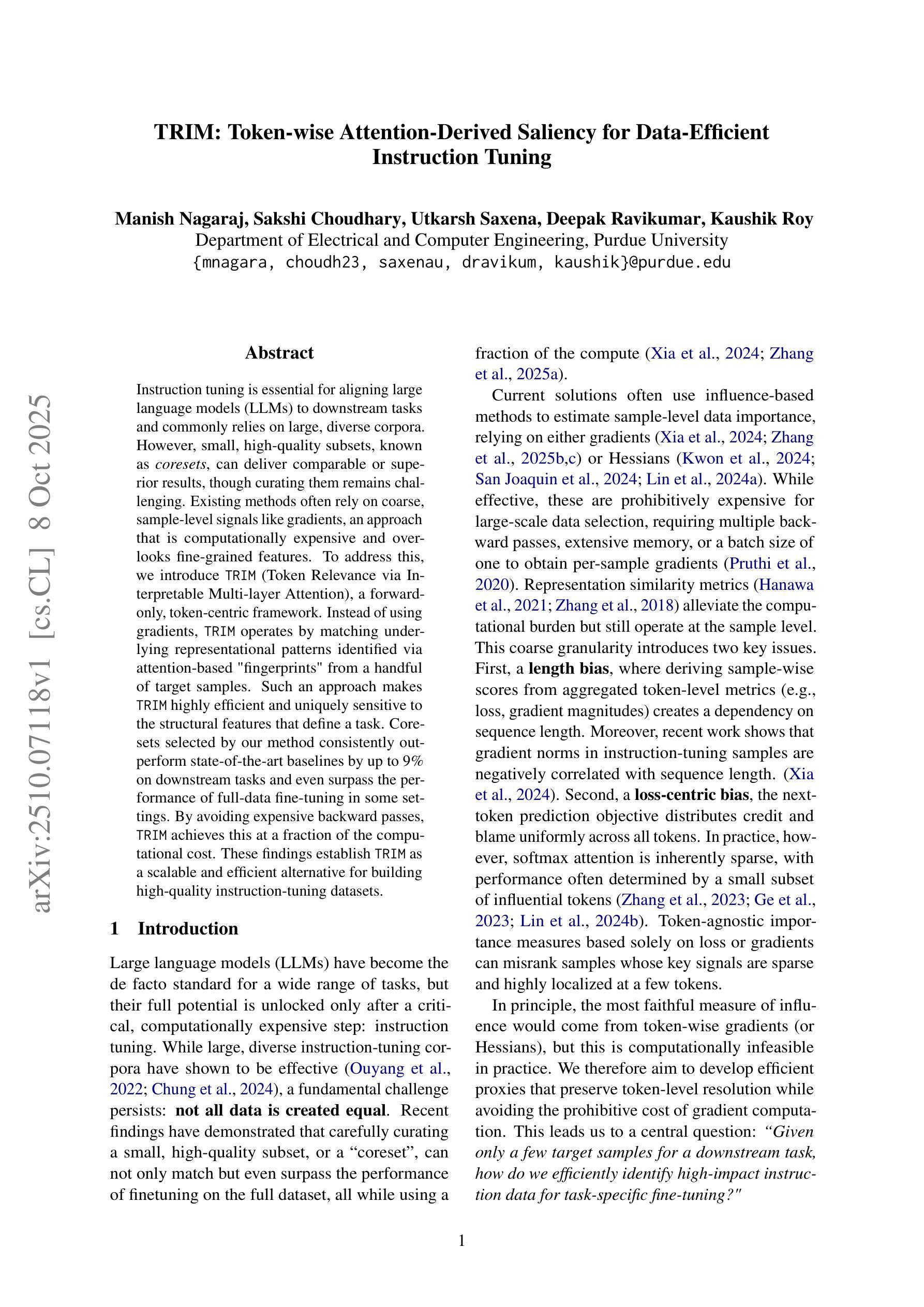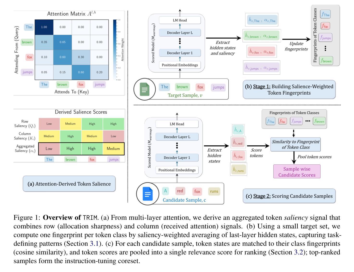 指令微调对于将大型语言模型(LLM)与下游任务对齐至关重要,通常依赖于大规模、多样化的语料库。然而,小型高质量子集,也称为核心集,可以产生相当或更好的结果,尽管对其进行策划仍然具有挑战性。现有方法通常依赖于粗略的样本级信号,如梯度,这种方法计算量大,并且忽略了细粒度特征。为了解决这个问题,我们引入了TRIM(通过可解释的多层注意力获取令牌相关性),这是一个仅前向、以令牌为中心的框架。TRIM不通过梯度工作,而是通过匹配少量目标样本中通过注意力“指纹”识别出的潜在表示模式来运行。这种方法使TRIM具有高效率,并且对定义任务的结构特征具有独特敏感性。通过我们的方法选择的核心集在下游任务上始终超过最新基线高达9%,并在某些设置下甚至超过全数据精细调整的性能。通过避免昂贵的反向传递,TRIM以较小的计算成本实现了这一点。这些发现证明TRIM是一种可扩展和高效的构建高质量指令调整数据集的替代方案。