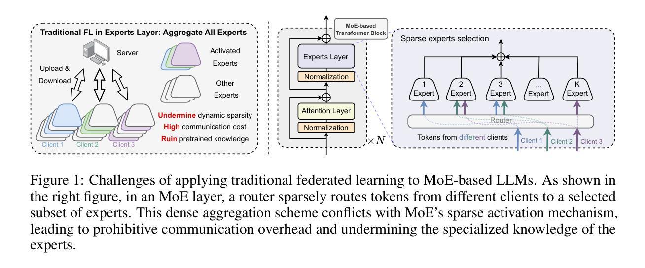 联合训练大型语言模型(LLM)在面临客户间数据的巨大异质性时面临挑战,这要求强大的个性化能力。专家混合(MoE)架构中的专家可以专注于不同的数据模式,为此类挑战提供了自然的架构解决方案。MoE架构的内在稀疏性,通过有选择地激活专家来实现,对其与联邦学习(FL)的集成提出了重大挑战。传统的FL框架,设计为适用于密集模型,会无差别地聚合所有专家参数,而不考虑其本地激活模式。这种简单的方法不仅破坏了MoE的动态稀疏性,而且还可能破坏预训练专家中的世界知识。