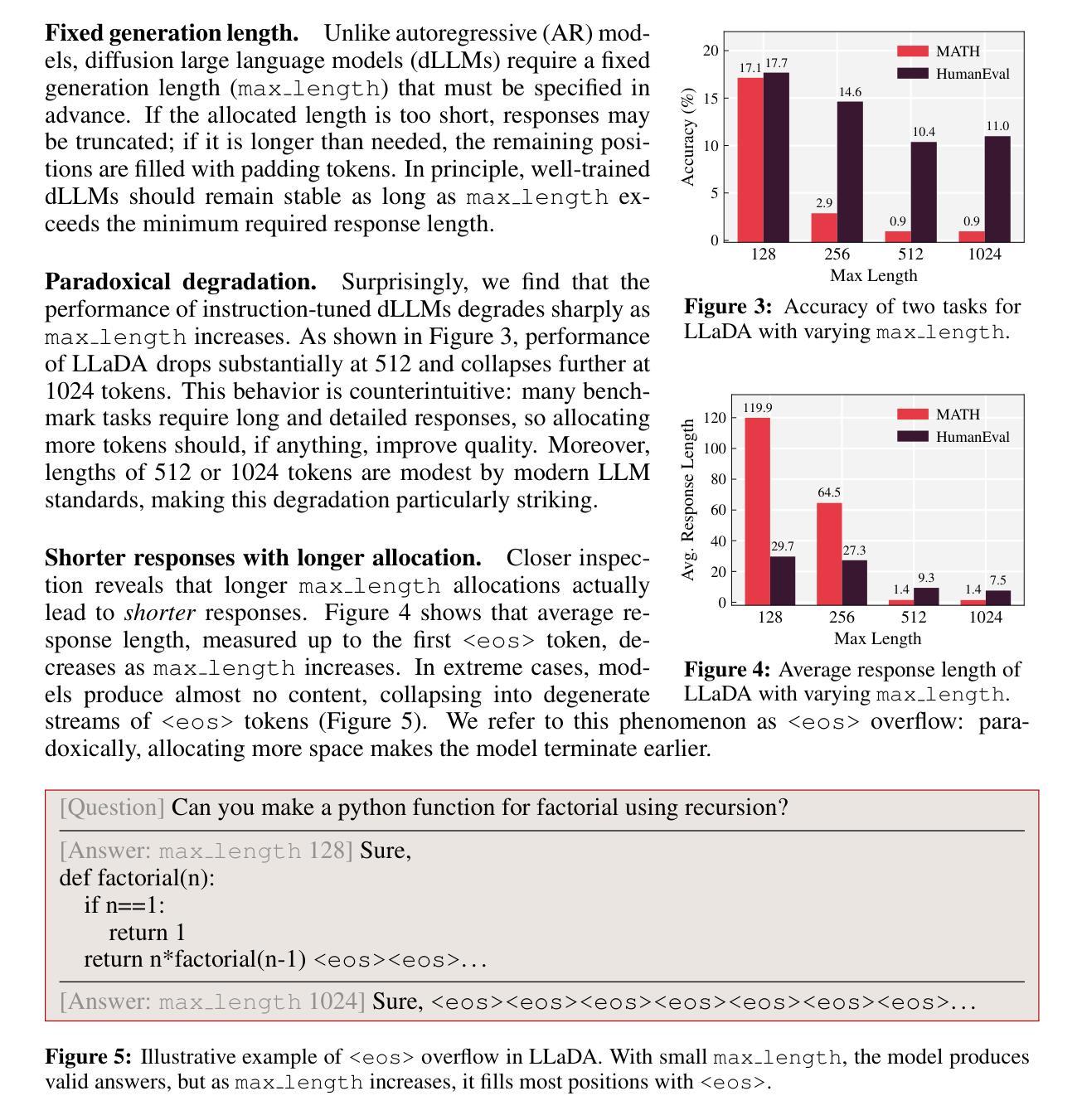 - 指令调优的dLLMs存在“溢出”问题,即在序列长度增加时响应反而变短。