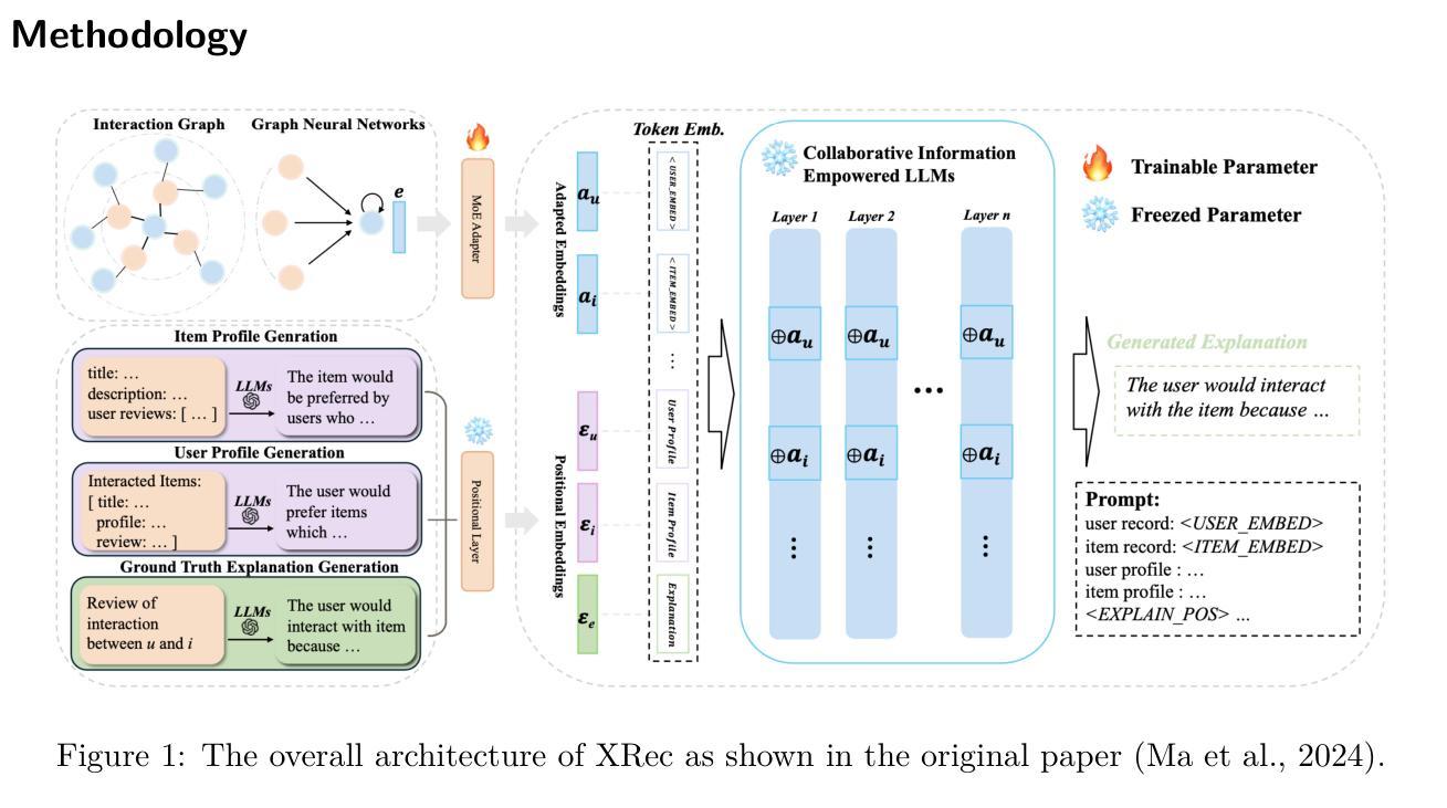 该研究中,成功复制了Ma等人(于报告截至时间次年)《基于大型语言模型的解释性推荐研究》(简称“XRec”)的成果,旨在验证该推荐模型的泛化性,并将开源工具扩展以适应解释的交互模式。以基于语言模型的协同调整指令对原代码进行改进,并发现XRec在生成个性化解释方面表现良好,但并非在所有指标上均优于基线模型。研究亮点在于揭示了专家混合嵌入在解释结构形成中的关键作用,且有助于展示协同信号与语言模型的相互作用机制。更多详细研究资料可访问相关代码库(链接:https://github.com/julianbibo/xrec-reproducibility)。