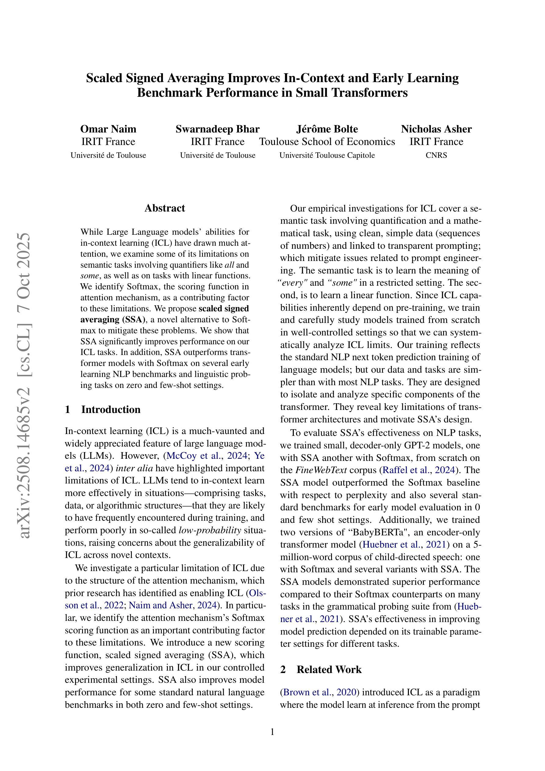 虽然大型语言模型在上下文学习(ICL)的能力上得到了广泛关注,但我们对一些语义任务的局限性进行了探究,这些任务涉及量词“所有”、“一些”,以及涉及线性函数的任务。我们确定了注意力机制中的评分函数Softmax是导致这些局限性的因素之一。为此,我们提出了Softmax的替代方案——带符号缩放平均法(SSA),以缓解这些问题。我们证明SSA在ICL任务上的表现有了显著提高。此外,在零样本和少样本设置中,SSA在多个早期学习NLP基准测试和语言学探测任务上的表现优于使用Softmax的Transformer模型。