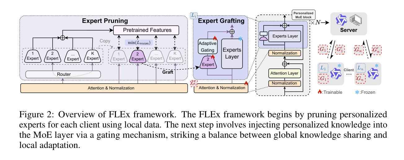 为了解决这一问题,我们提出了FLEx(带有个性化专家的联邦LLM)这一新型框架,该框架利用基于MoE的预训练LLM进行有效个性化。FLEx只聚合共享的非专家参数,从而显著减少通信开销并保留冻结的预训练专家内的世界知识。对于个性化,我们引入了一种新的专家嫁接机制,该机制利用动态稀疏性从预训练专家中选择组件构建针对特定客户的专家,以适应本地数据。然后,将此嫁接的专家与门控机制一起进行本地微调。这种联合训练使模型能够学习何时利用来自冻结的专家的共享知识,以及何时使用个性化的知识。