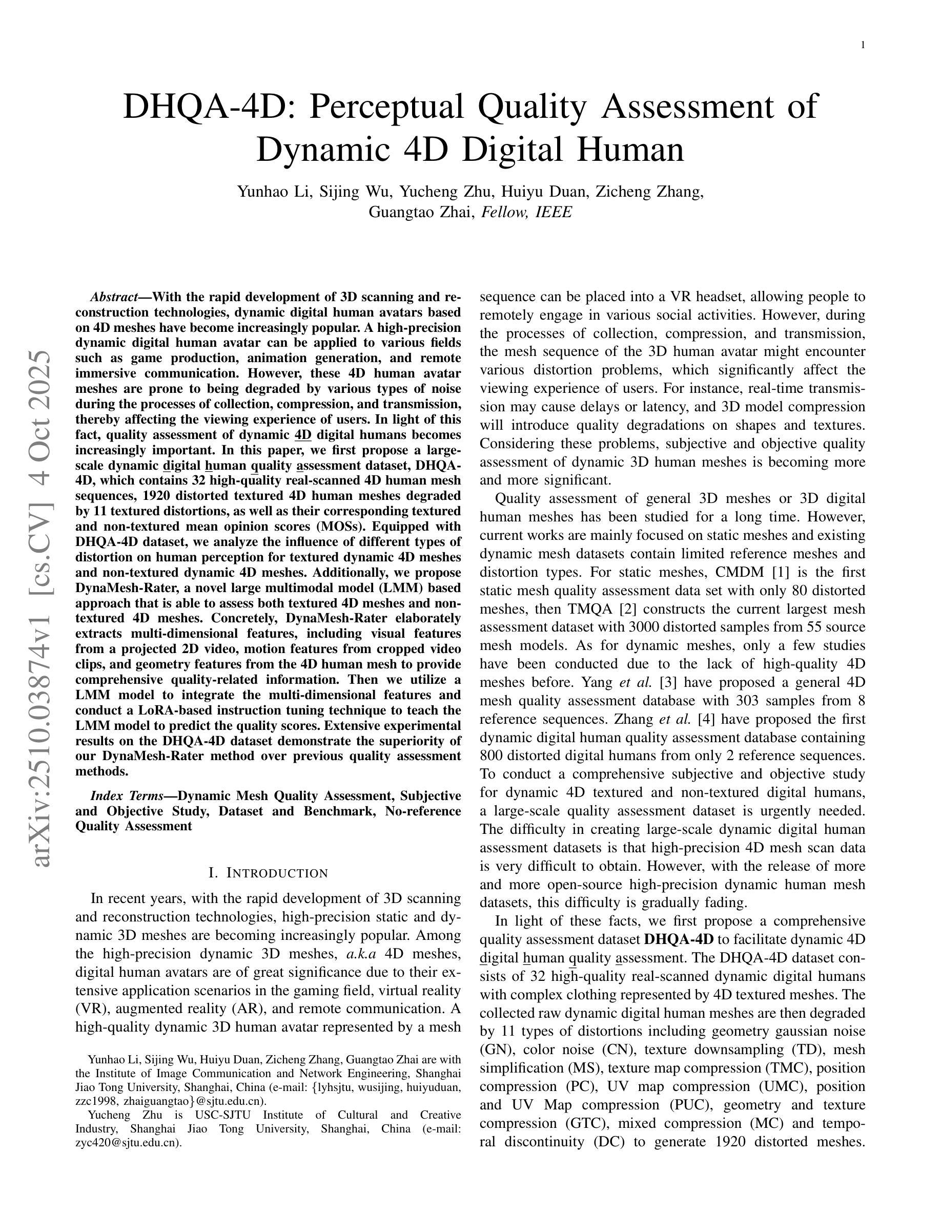随着3D扫描和重建技术的快速发展,基于4D网格的动态数字人类化身变得越来越流行。高精度动态数字人类化身可应用于游戏制作、动画生成和远程沉浸式通信等各种领域。然而,这些4D人类化身网格在收集、压缩和传输过程中容易受到各种噪声的干扰,从而影响用户的使用体验。鉴于此,对动态4D数字人类的质量评估变得日益重要。在本文中,我们首先提出了大规模动态数字人类质量评估数据集DHQA-4D,其中包含32个高质量真实扫描的4D人类网格序列、1920个由11种纹理失真降级的失真纹理4D人类网格,以及它们相应的纹理和非纹理平均意见得分(MOSs)。配备DHQA-4D数据集,我们分析了不同类型失真对纹理动态4D网格和非纹理动态4D网格的人类感知的影响。此外,我们提出了DynaMesh-Rater,这是一种基于大型多模态模型(LMM)的新方法,能够评估纹理4D网格和非纹理4D网格。具体来说,DynaMesh-Rater精心提取了多维特征,包括从投影的2D视频中提取的视觉特征、从裁剪的视频片段中提取的运动特征以及从4D人类网格中提取的几何特征,以提供全面的质量相关信息。然后,我们利用LMM模型来整合这些多维特征,并采用基于LoRA的指令微调技术来教导LMM模型预测质量分数。在DHQA-4D数据集上的广泛实验结果证明了我们的DynaMesh-Rater方法相较于之前的质量评估方法的优越性。