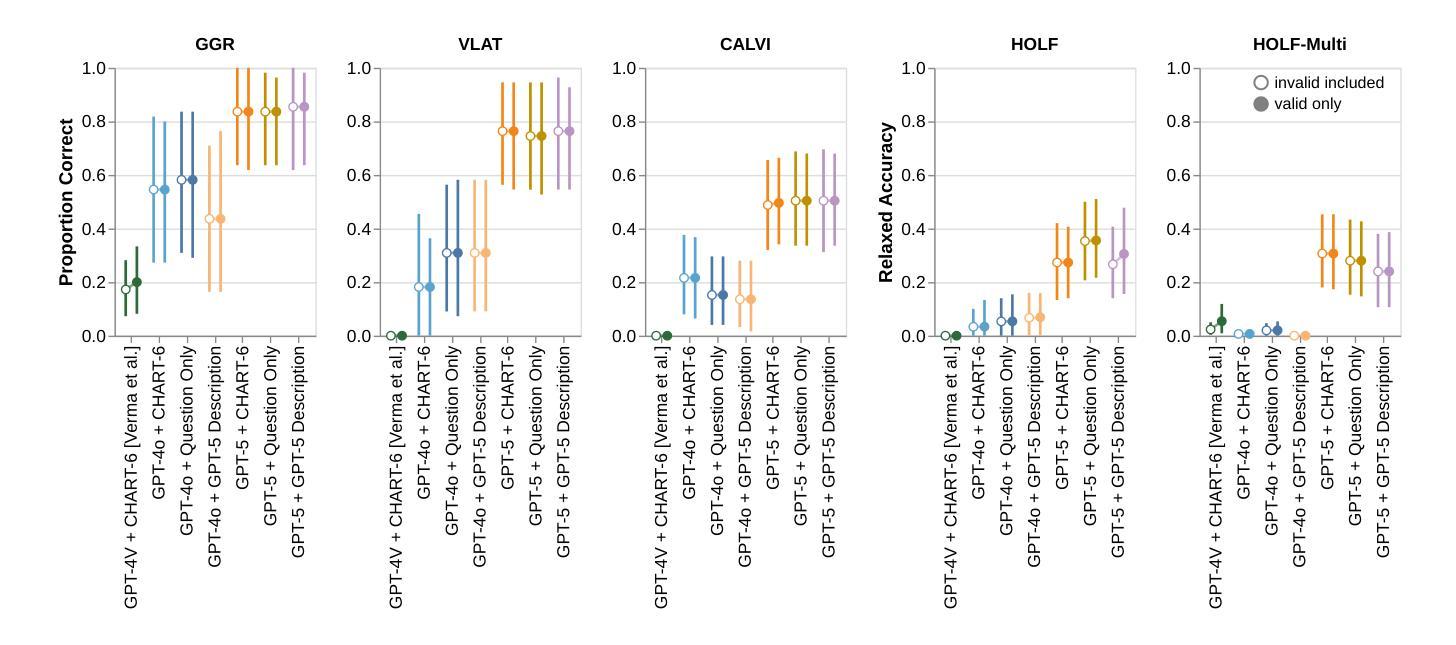 We present a quantitative evaluation to understand the effect of zero-shot large-language model (LLMs) and prompting uses on chart reading tasks. We asked LLMs to answer 107 visualization questions to compare inference accuracies between the agentic GPT-5 and multimodal GPT-4V, for difficult image instances, where GPT-4V failed to produce correct answers. Our results show that model architecture dominates the inference accuracy: GPT5 largely improved accuracy, while prompt variants yielded only small effects. Pre-registration of this work is available here: https://osf.io/u78td/?view_only=6b075584311f48e991c39335c840ded3; the Google Drive materials are here:https://drive.google.com/file/d/1ll8WWZDf7cCNcfNWrLViWt8GwDNSvVrp/view.