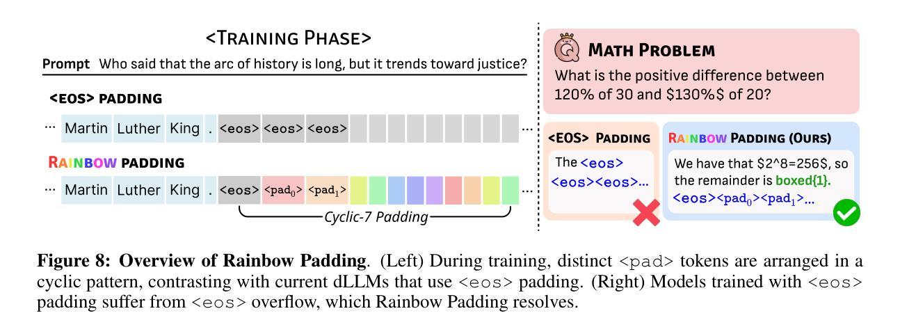 溢出”的关键漏洞:随着分配序列长度的增加,响应却矛盾地变得更短,陷入提前终止或退化为一连串的 标记。虽然在实践中已经注意到这个问题,但尚未对其进行系统分析。我们追溯其根源到 的双重角色,既是终止符又是填充符,这将在后面的位置集中概率质量,并向后传播以触发提前终止。为了解决这一问题,我们引入了Rainbow Padding,这是一种简单的补救措施,用重复的填充令牌循环替换重复的 占位符,分散概率质量并打破 的主导地位。实验表明,Rainbow Padding极大地提高了长度稳健性和输出质量,只需七个填充令牌就足以防止提前终止。此外,该方法可以有效地集成到现有的指令调整模型中:只需对少量数据进行LoRA微调一个周期即可取得显著改进,这使得此解决方案非常实用。代码可在https://github.com/quasar529/rainbow-padding公开访问。