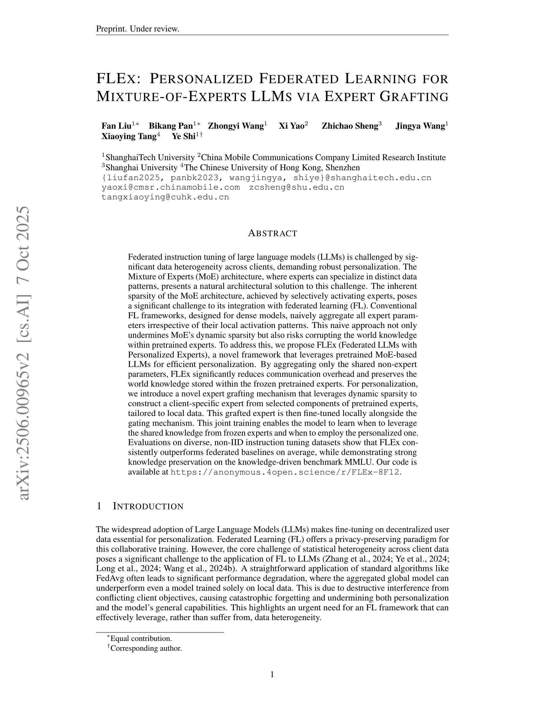 Federated instruction tuning of large language models (LLMs) is challenged by significant data heterogeneity across clients, demanding robust personalization. The Mixture of Experts (MoE) architecture, where experts can specialize in distinct data patterns, presents a natural architectural solution to this challenge. The inherent sparsity of the MoE architecture, achieved by selectively activating experts, poses a significant challenge to its integration with federated learning (FL). Conventional FL frameworks, designed for dense models, naively aggregate all expert parameters irrespective of their local activation patterns. This naive approach not only undermines MoE’s dynamic sparsity but also risks corrupting the world knowledge within pretrained experts. To address this, we propose FLEx (Federated LLMs with Personalized Experts), a novel framework that leverages pretrained MoE-based LLMs for efficient personalization. By aggregating only the shared non-expert parameters, FLEx significantly reduces communication overhead and preserves the world knowledge stored within the frozen pretrained experts. For personalization, we introduce a novel expert grafting mechanism that leverages dynamic sparsity to construct a client-specific expert from selected components of pretrained experts, tailored to local data. This grafted expert is then fine-tuned locally alongside the gating mechanism. This joint training enables the model to learn when to leverage the shared knowledge from frozen experts and when to employ the personalized one. Evaluations on diverse, non-IID instruction tuning datasets show that FLEx consistently outperforms federated baselines on average, while demonstrating strong knowledge preservation on the knowledge-driven benchmark MMLU. Our code is available at \href{https://anonymous.4open.science/r/FLEx-8F12}{\texttt{https://anonymous.4open.science/r/FLEx-8F12}}.