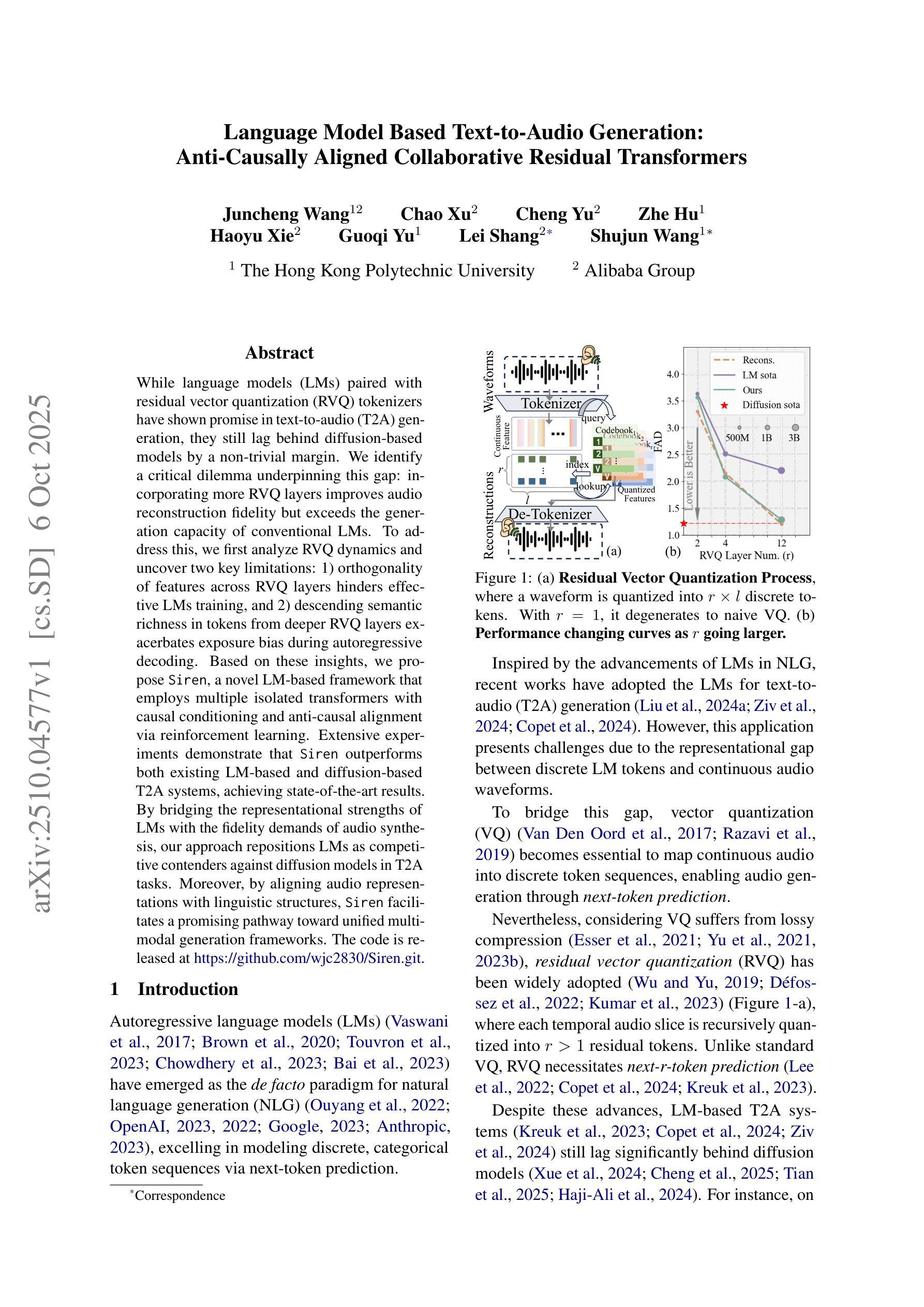 While language models (LMs) paired with residual vector quantization (RVQ) tokenizers have shown promise in text-to-audio (T2A) generation, they still lag behind diffusion-based models by a non-trivial margin. We identify a critical dilemma underpinning this gap: incorporating more RVQ layers improves audio reconstruction fidelity but exceeds the generation capacity of conventional LMs. To address this, we first analyze RVQ dynamics and uncover two key limitations: 1) orthogonality of features across RVQ layers hinders effective LMs training, and 2) descending semantic richness in tokens from deeper RVQ layers exacerbates exposure bias during autoregressive decoding. Based on these insights, we propose Siren, a novel LM-based framework that employs multiple isolated transformers with causal conditioning and anti-causal alignment via reinforcement learning. Extensive experiments demonstrate that Siren outperforms both existing LM-based and diffusion-based T2A systems, achieving state-of-the-art results. By bridging the representational strengths of LMs with the fidelity demands of audio synthesis, our approach repositions LMs as competitive contenders against diffusion models in T2A tasks. Moreover, by aligning audio representations with linguistic structures, Siren facilitates a promising pathway toward unified multi-modal generation frameworks.