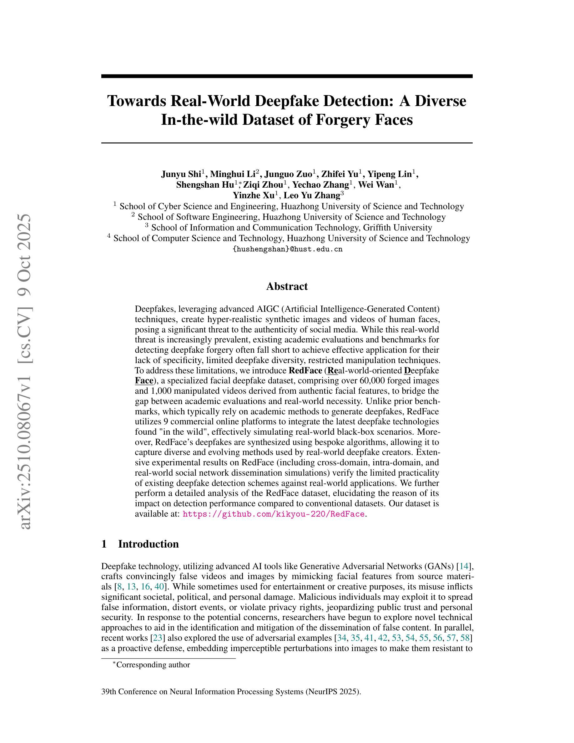 借助先进的人工智能生成内容(AIGC)技术,深度伪造(Deepfakes)能创造出超逼真的人脸合成图像和视频,对社交媒体的真实性构成重大威胁。针对学术评估在检测深度伪造方面的局限性,我们推出了RedFace数据集,包含超过6万张伪造图像和1000个经真实面部特征操作的视频,以弥补学术评估与实际应用之间的鸿沟。RedFace利用9个商业在线平台集成最新的深度伪造技术,模拟真实世界的黑箱场景。此外,RedFace的伪造图像采用专用算法合成,能捕捉现实世界中深度伪造创作者使用的多样化和不断演变的方法。