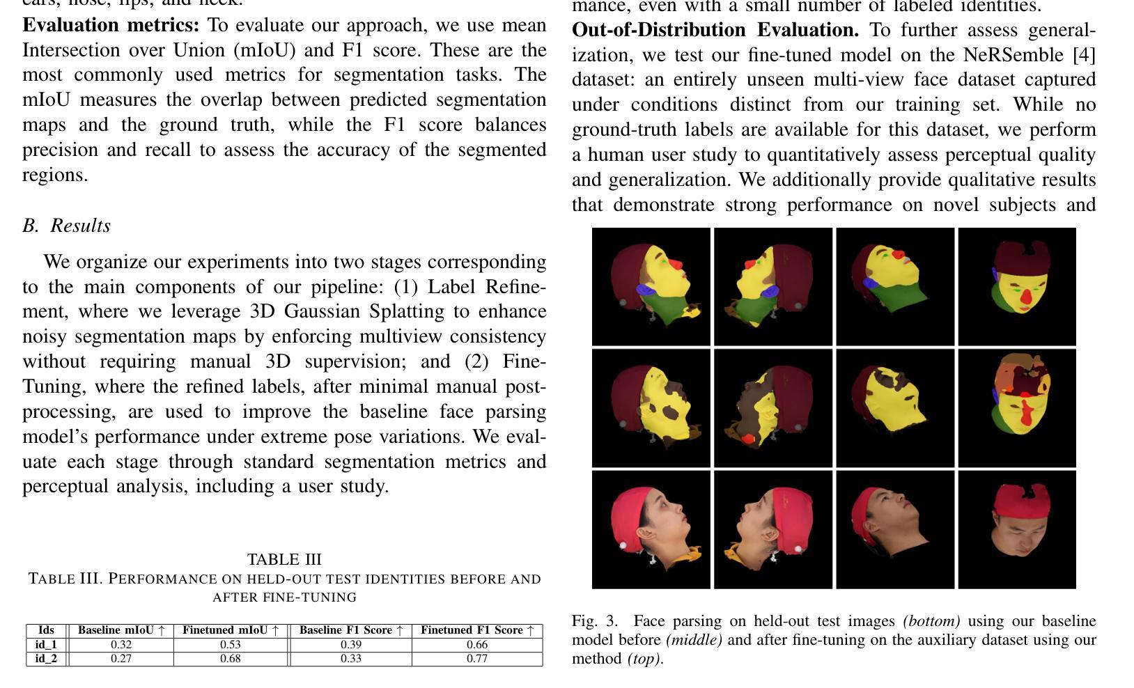 在极端视角下准确进行人脸解析仍然是一个重大挑战,因为在这些姿势下的标记数据有限。手动标注成本高昂,在大规模场景下往往不切实际。我们提出了一种新型标签优化管道,它利用3D高斯拼贴(3DGS)技术,从嘈杂的多视角预测中生成精确的分割蒙版。我们通过联合拟合两个3DGS模型,一个用于RGB图像,一个用于其初始分割图,通过共享几何结构来强制执行多视角一致性,从而实现了仅用最小的后期处理就能合成姿态多样的训练数据。在精细化数据集上对人脸解析模型进行微调,能显著提高在具有挑战的头部位姿上的准确度,同时在标准视图上保持强大的性能。包括人类评估在内的广泛实验表明,我们的方法即使在不需要真实3D注释的情况下,仅使用一组初始图像也能达到优于最新技术的方法的优越结果。我们的方法提供了一个可扩展且有效的解决方案,能在现实世界中提高人脸解析的稳健性。