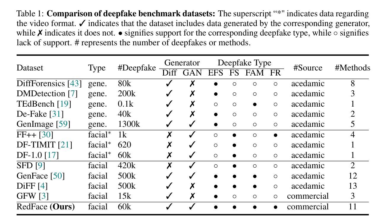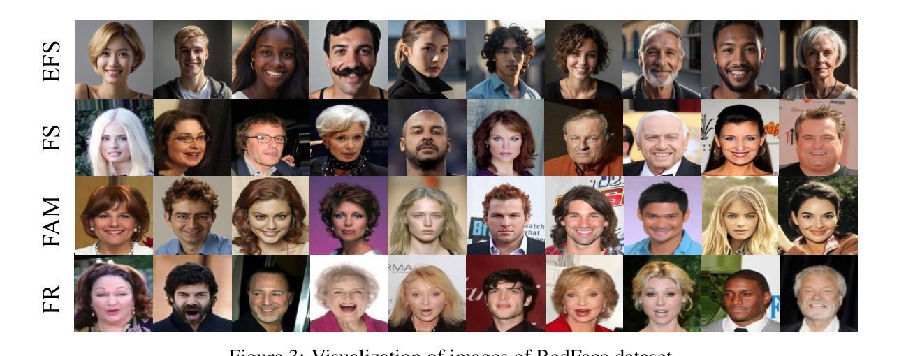 - RedFace的伪造图像采用专用算法合成,以捕捉现实世界中深度伪造创作者的多样化方法。