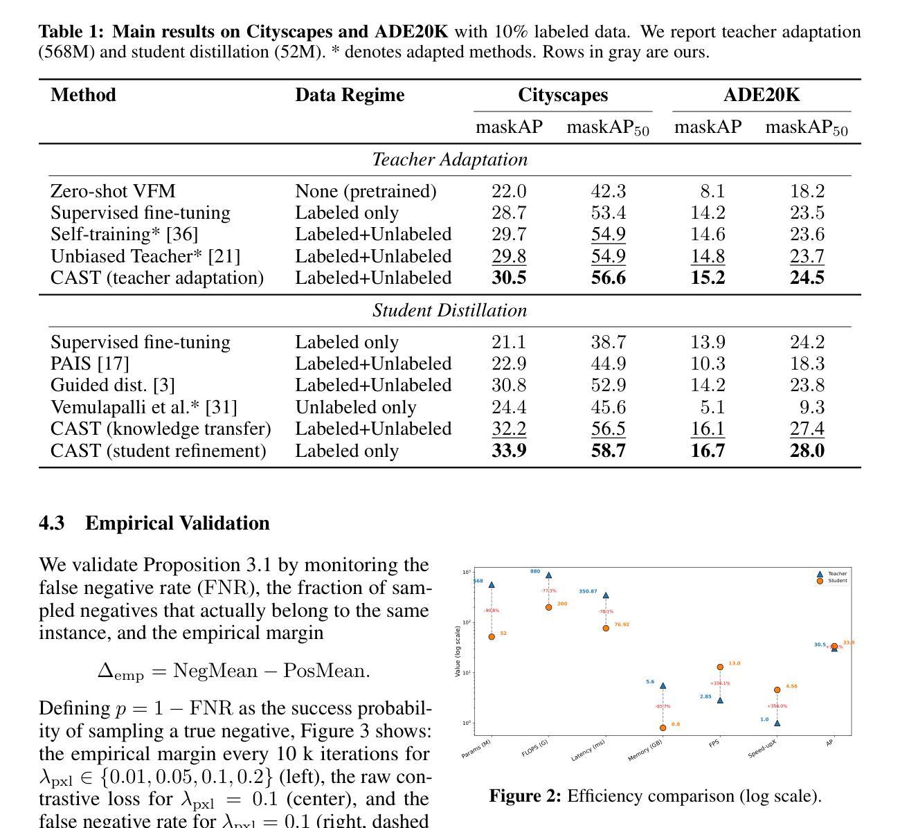 实例分割需要昂贵的逐像素标注和计算密集型的模型。我们引入了CAST,这是一种半监督知识蒸馏(SSKD)框架,它利用有限的标记数据和大量的无标记数据,将预训练的视觉基础模型(VFM)压缩成紧凑的专家模型。CAST分为三个阶段:(1)通过对比校准进行自我训练的VFM域适应,(2)通过统一的多目标损失进行知识迁移,(3)学生精炼,以减轻残留的伪标签偏见。CAST的核心是实例感知像素级对比损失,它融合掩膜和类别分数来提取信息负样本并强制实施清晰的实例间边界。通过在整个适应和蒸馏过程中保持对比信号,我们使教师和学生嵌入对齐,并充分利用无标签图像。在Cityscapes和ADE20K上,我们较小的~11倍学生模型超过了其零样本VFM教师模型,提高了+8.5和+7.1 AP;超越了适应的教师模型,提高了+3.4和+1.5 AP;并且在两个基准测试上都超越了最新的SSKD方法。