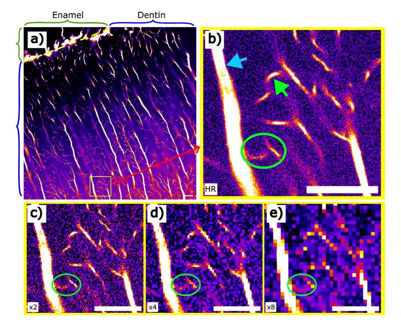 牙齿机械感受系统部分依赖于牙本质内流体流动对成牙本质细胞的刺激。为观察微观结构,通常采用共聚焦荧光显微镜,但视野受限。本研究应用深度学习超分辨率技术处理图像,提升图像质量并扩大视野。对比了多种监督与非监督模型,以像素放大倍数评估性能。采用生物学驱动的评估方法分析模型性能,发现不同模型对弱特征敏感度不同,解释了一般评估指标不一致的原因。