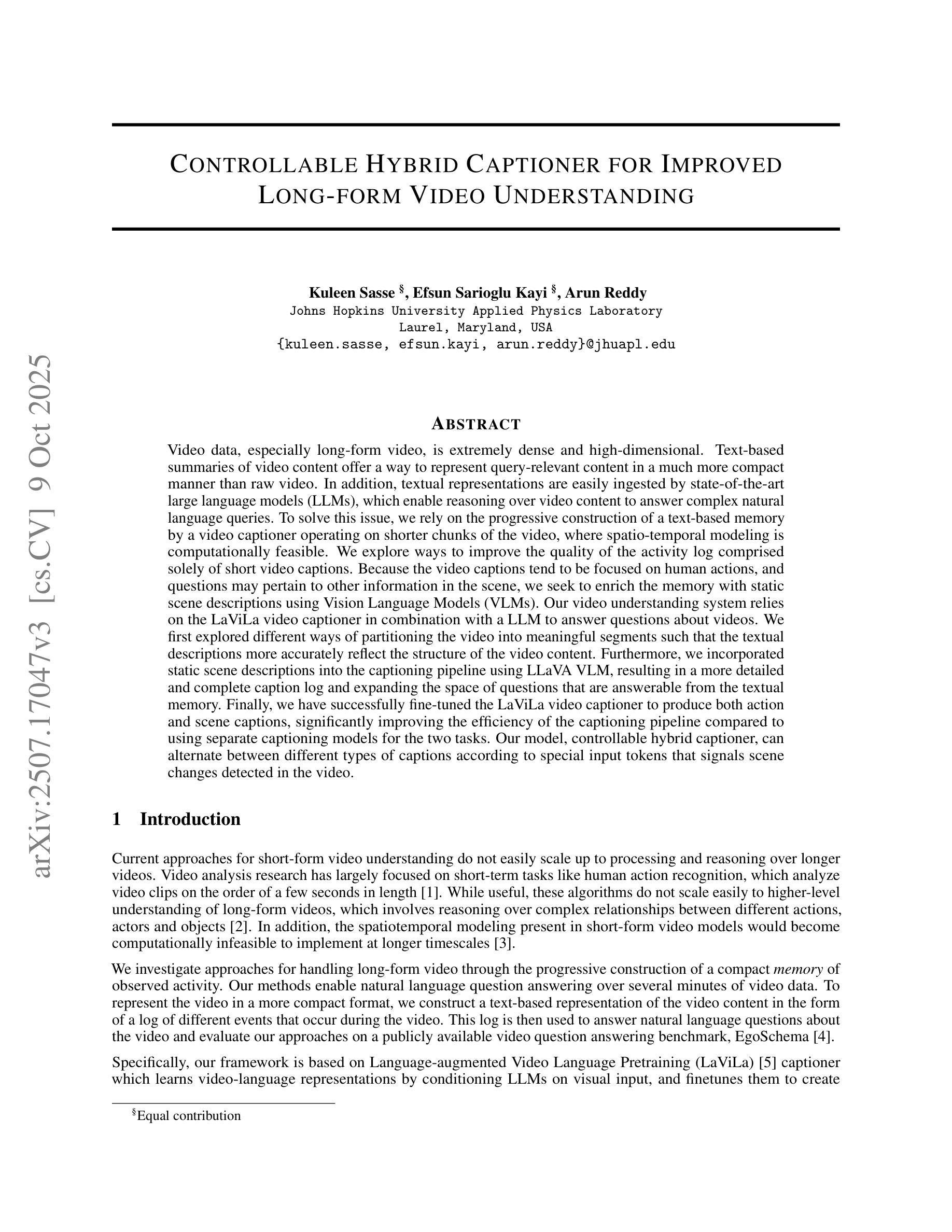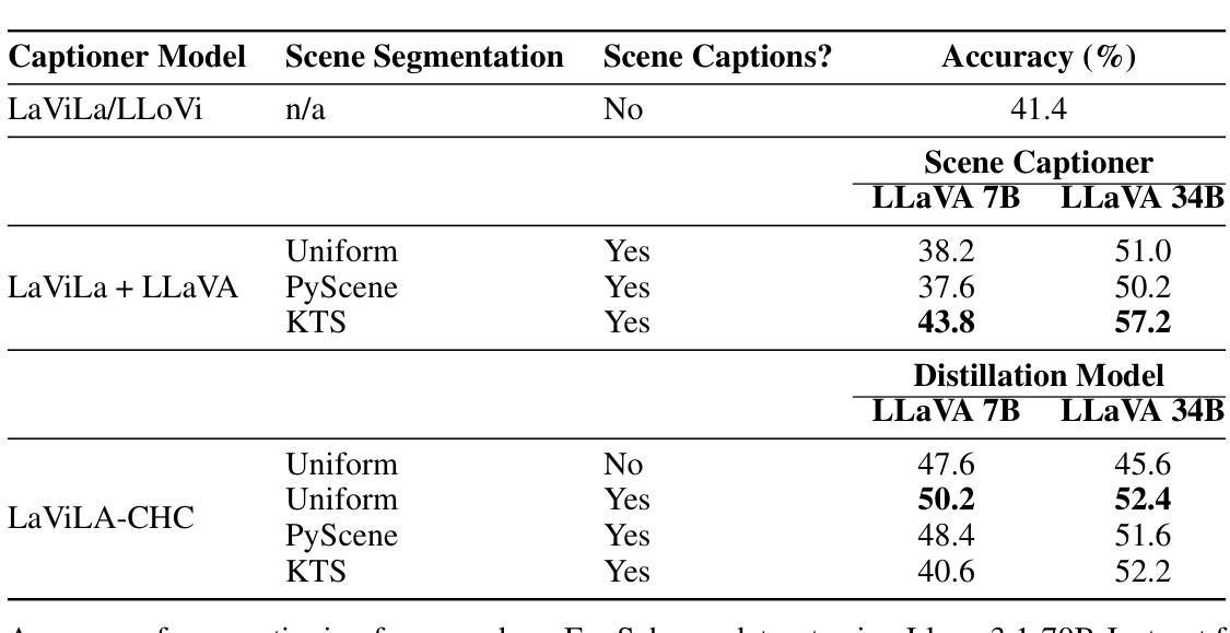视频数据,特别是长视频,极为密集且高维。基于文本的视频内容摘要提供了一种比原始视频更紧凑地表示查询相关内容的方式。此外,文本表示很容易被最新的大型语言模型(LLM)所接纳,能够推理视频内容以回答复杂的自然语言查询。为了解决这个问题,我们依赖于由操作视频较短片段的视频字幕器逐步构建的基于文本的存储器,其中时空建模是计算可行的。我们探索了提高仅由短视频字幕构成的活动日志质量的方法。由于视频字幕往往侧重于人类行为,而问题可能与场景中的其他信息有关,我们寻求使用视觉语言模型(VLM)丰富存储器中的静态场景描述。我们的视频理解系统依赖于LaViLa视频字幕器与LLM相结合来回答有关视频的问题。我们首先探索了将视频分割成有意义片段的不同方式,以使文本描述更准确地反映视频内容的结构。此外,我们利用LLaVA VLM将静态场景描述融入字幕管道,从而得到更详细和完整的字幕日志,并扩大了可从文本存储器中回答的问题空间。最后,我们已经成功地对LaViLa视频字幕器进行了微调,以产生动作和场景字幕,与为两个任务使用单独的字幕模型相比,这大大提高了字幕管道的效率。我们的可控混合字幕器模型可以根据视频中的场景变化等特殊输入令牌在不同类型字幕之间进行切换。