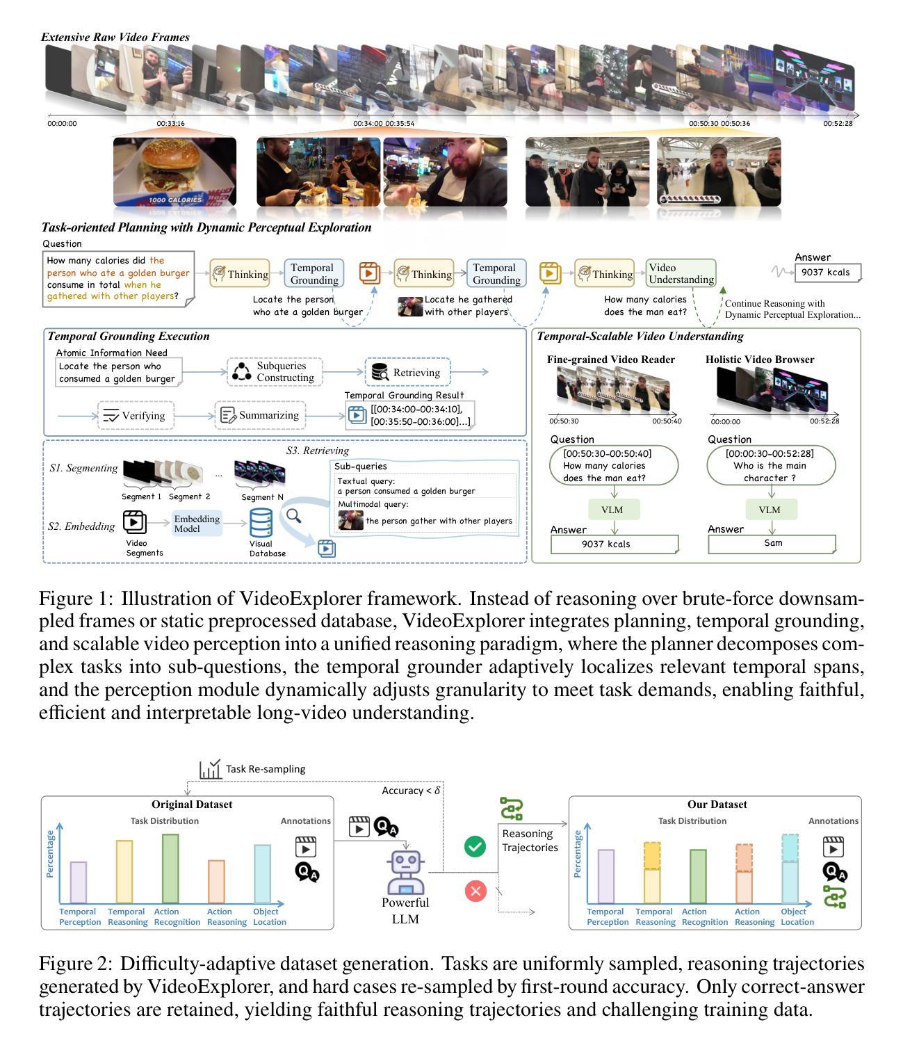 视频理解中的一个挑战是处理长视频内容。现有方法会忽略细节或在任务无关的表示上进行文本推理,从而影响特定任务的感知和探索。本研究提出了VideoExplorer框架,通过“用视频思考”原则将规划、时间定位以及可伸缩感知自然结合到一个连贯的推理过程中。VideoExplorer能迭代地提出子问题、定位关键时刻并进行面向任务的、可伸缩的视频理解,直至得到最终答案,实现忠实、高效和可解释的推理。为解决长视频理解训练资源匮乏的问题,研究构建了基于难度自适应采样的长视频推理数据集,设计了包括监督轨迹初始化和轨迹级偏好优化的两阶段训练流程。评估结果表明,VideoExplorer相较于现有基线有显著优势,展现出稳健性、适应性和高效性。