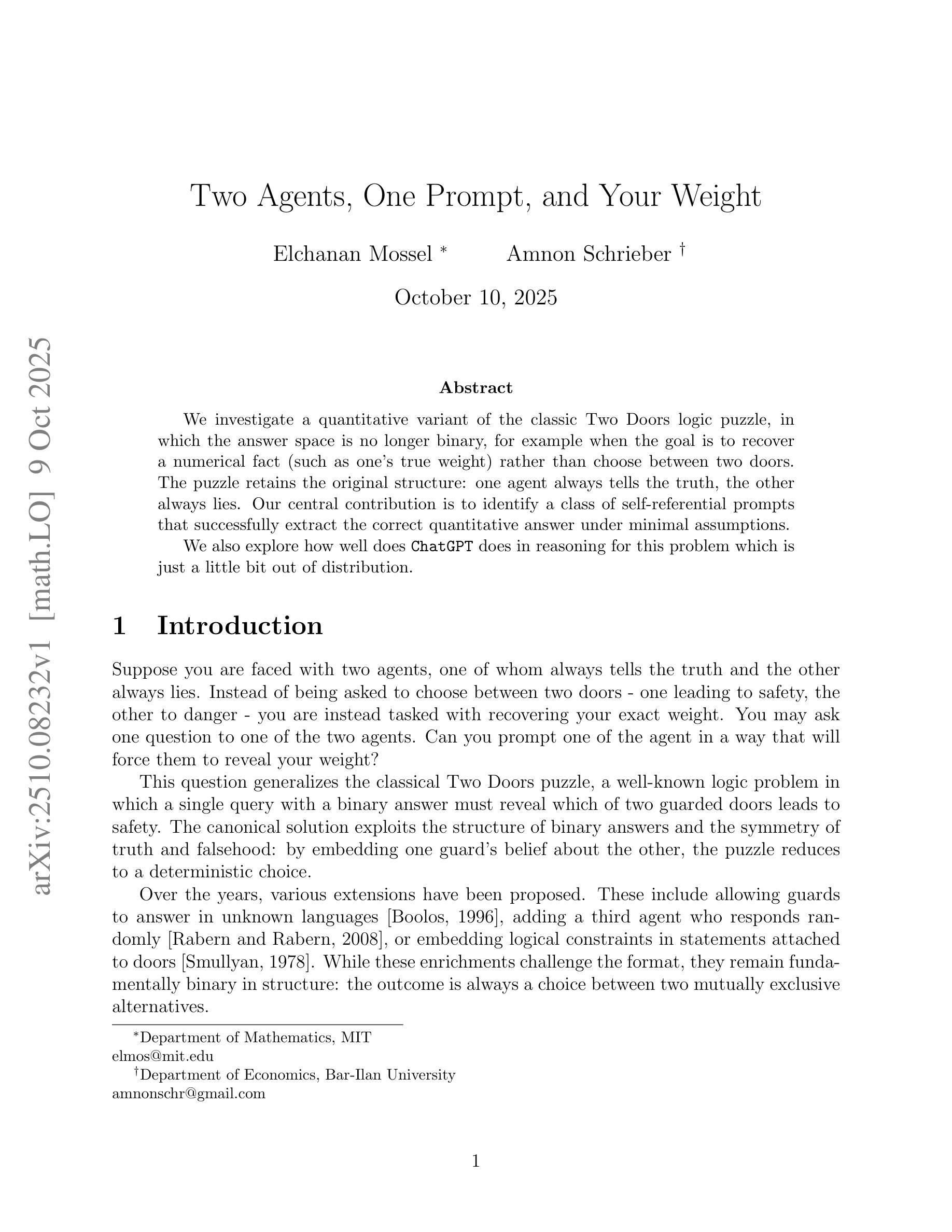 本文探讨了经典的两门逻辑难题的定量变体。当目标不再是二元选择(如选择两扇门中的一扇门),而是恢复数值事实(如真实体重)时,该难题如何保持原有的结构特点:一个代理人总是说实话,另一个总是说谎。本文的核心贡献是识别出一类自我参考的提示,这些提示能在最小的假设下成功提取出正确的定量答案。此外,本文还探讨了ChatGPT在这种稍微超出其常规处理范围的问题上的推理能力。