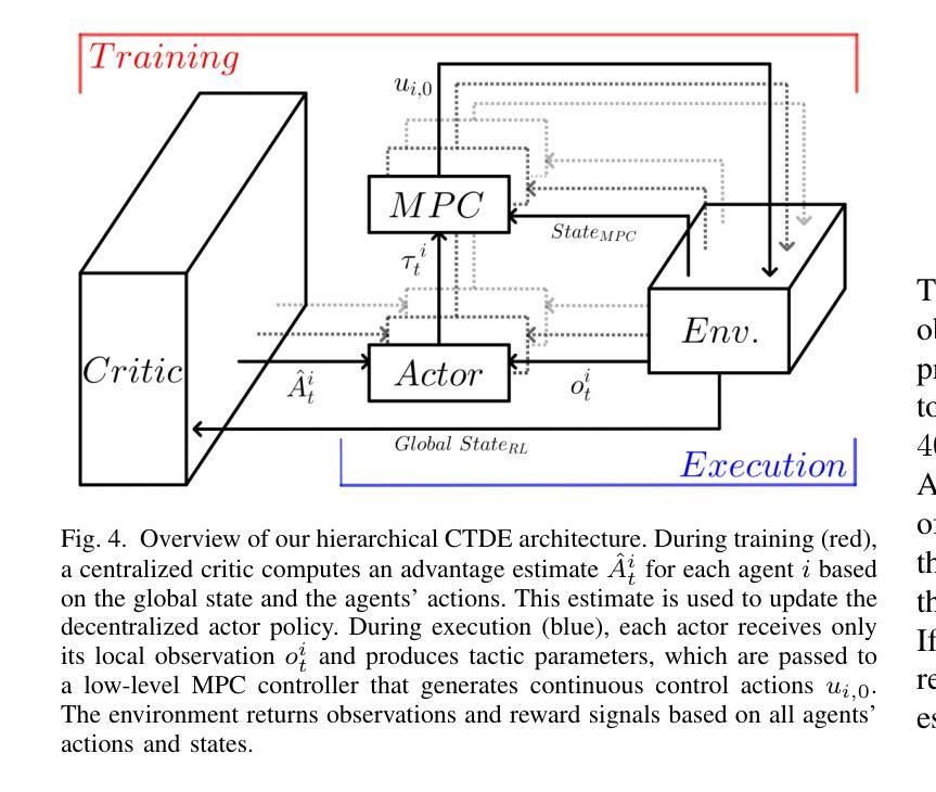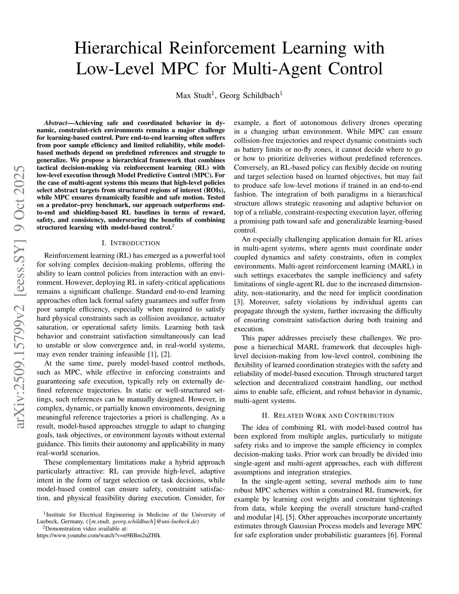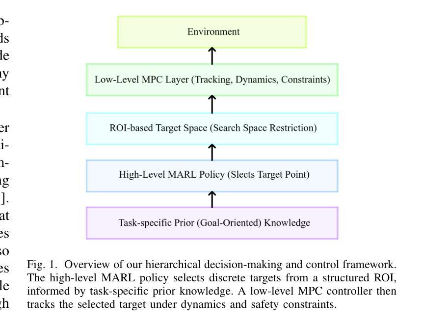 在动态、约束丰富的环境中实现安全和协调的行为仍然是基于学习的控制面临的一个主要挑战。纯端到端学习经常面临样本效率低和可靠性有限的问题,而基于模型的方法依赖于预先定义的参考,并且在泛化方面遇到困难。我们提出了一种层次框架,它通过强化学习(RL)进行战术决策,并通过模型预测控制(MPC)进行低级执行。在多智能体系统的情况下,这意味着高级策略从结构化感兴趣区域(ROI)中选择抽象目标,而MPC确保动态可行和安全运动。在捕食者-猎物基准测试上进行的测试表明,我们的方法在奖励、安全性和一致性方面优于端到端和基于屏蔽的RL基准测试,这突出了将结构化学习与基于模型的控制相结合的好处。