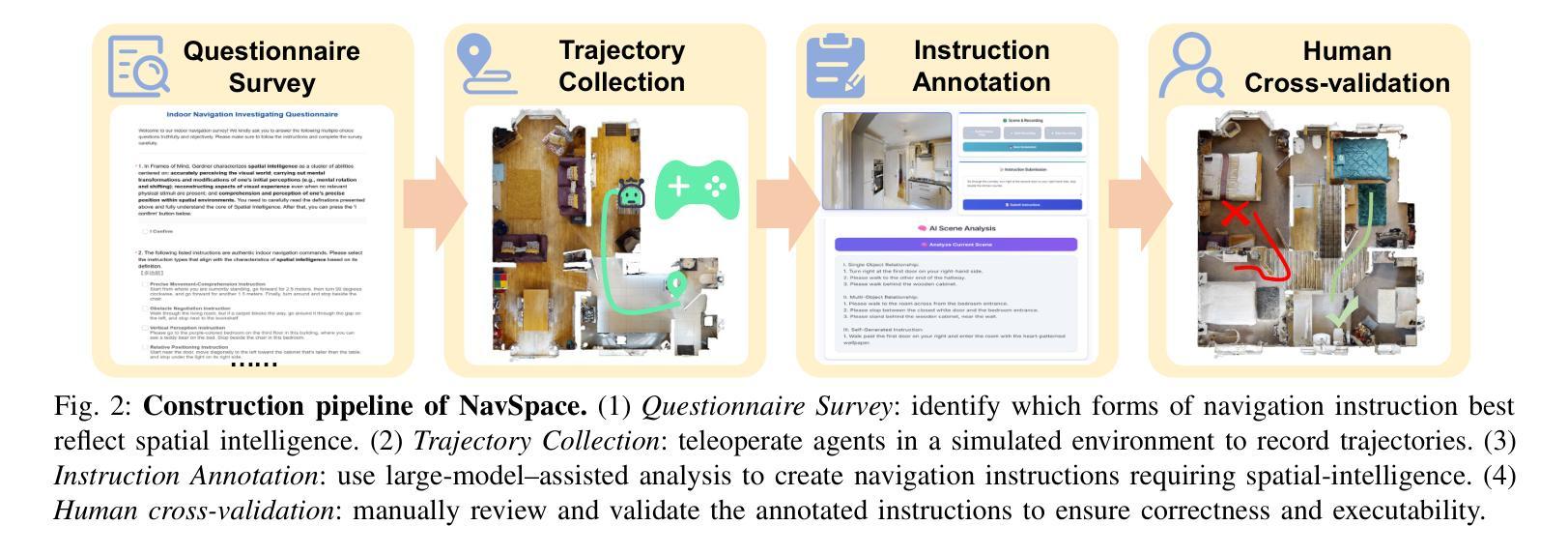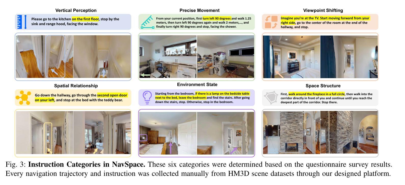 - NavSpace基准测试旨在全面测试导航系统的空间智能水平,包含六个任务类别和大量轨迹指令对。