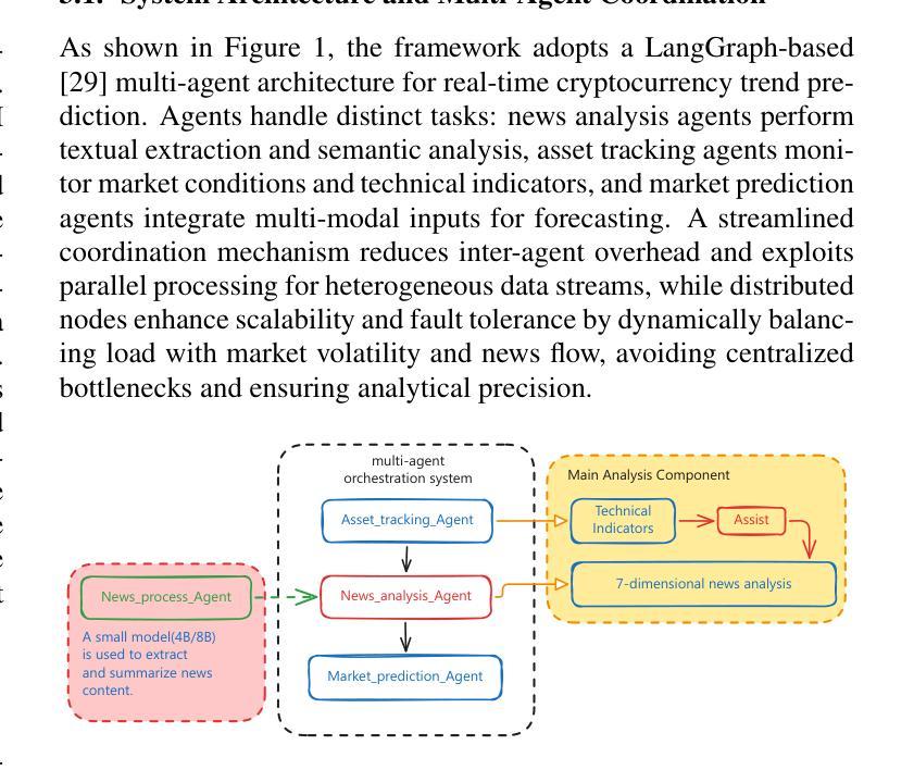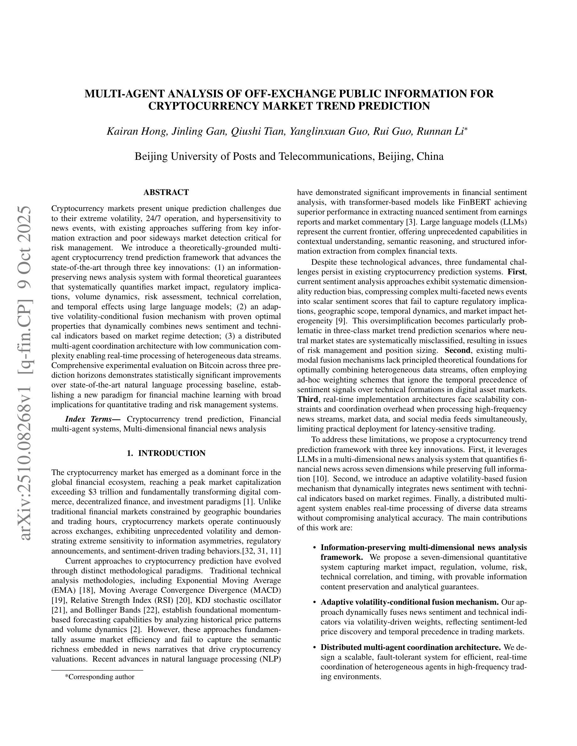 - 提出了一种多智能体加密货币趋势预测框架,包括信息保留的新闻分析系统、自适应波动条件融合机制和分布式多智能体协调架构。