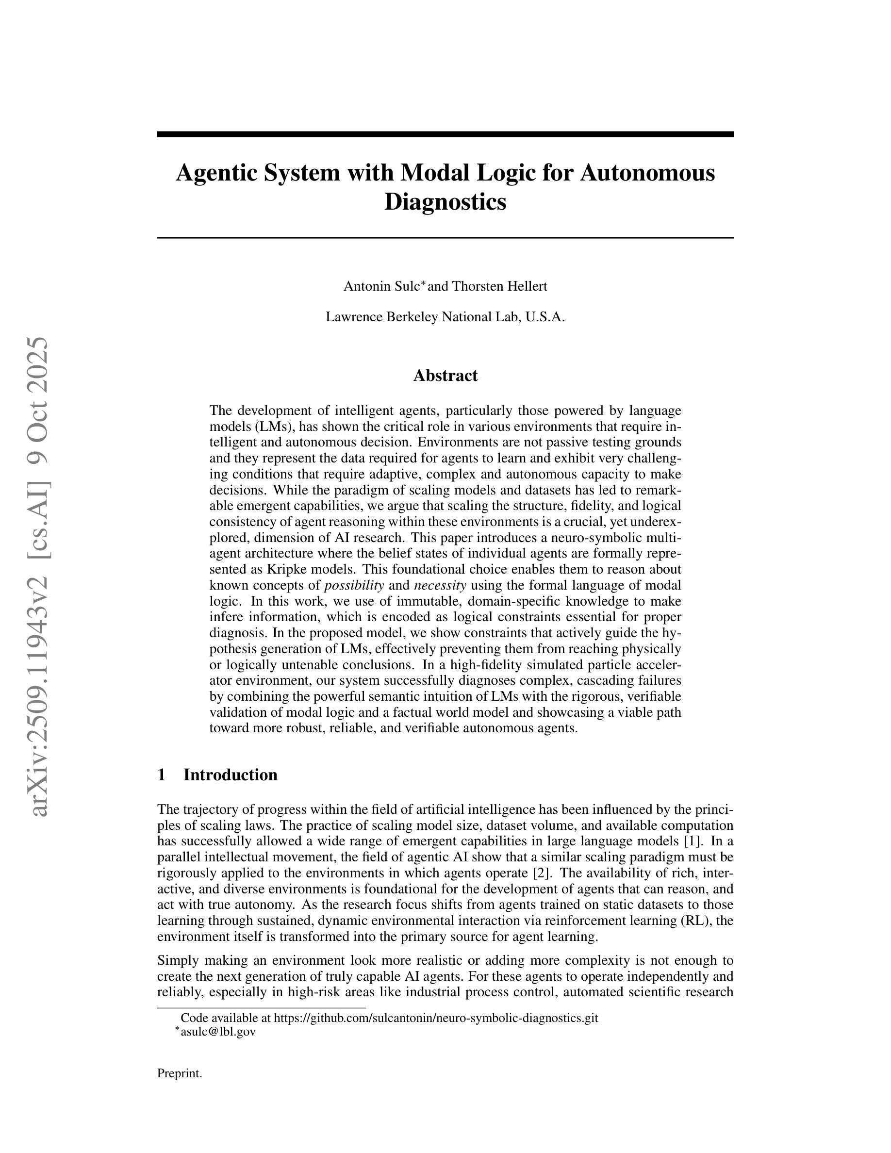智能体,特别是那些由语言模型(LMs)驱动的智能体的发展,已经显示出在各种需要智能和自主决策的环境中发挥着关键作用。环境并不是被动的测试场,它们代表着智能体所需要的数据,并且展示出各种具有挑战性的条件,这些条件需要智能体具备适应性强、复杂和自主的决策能力。尽管扩大模型和数据集的模式已经带来了显著的新兴能力,但我们认为扩大这些环境中智能体的结构、保真度和逻辑一致性是一个关键但尚未被充分研究的AI研究领域维度。本文介绍了一种神经符号多智能体架构,其中单个智能体的信念状态被形式化表示为Kripke模型。这一基本选择使他们能够利用模态逻辑的自然语言来推理“可能性”和“必要性”等已知概念。在这项工作中,我们使用不可变的领域特定知识来进行信息推断,这些信息被编码为逻辑约束,对于适当的诊断至关重要。在提出的模型中,我们展示了能够主动引导LMs假设生成的约束,有效地防止它们得出物理或逻辑上不可持续的结论。在一个高保真模拟粒子加速器环境中,我们的系统成功地结合了LMs的强大语义直觉、模态逻辑的严格可验证验证和一个事实世界模型,对复杂的连锁故障进行了诊断,并展示了一条朝着更稳健、可靠和可验证的自主智能体的可行道路。