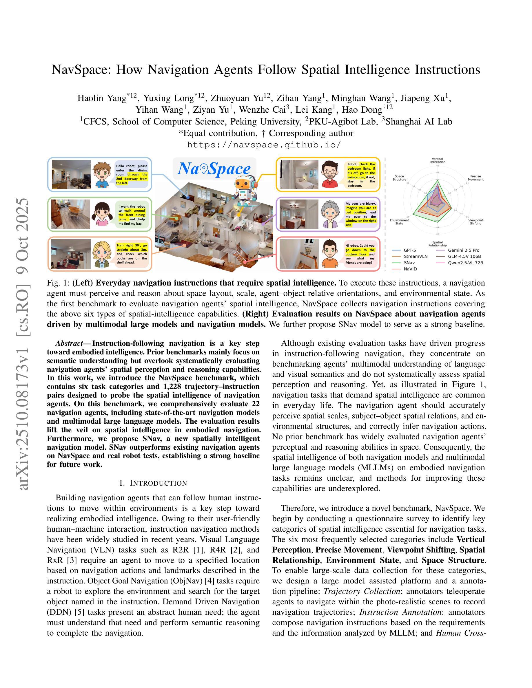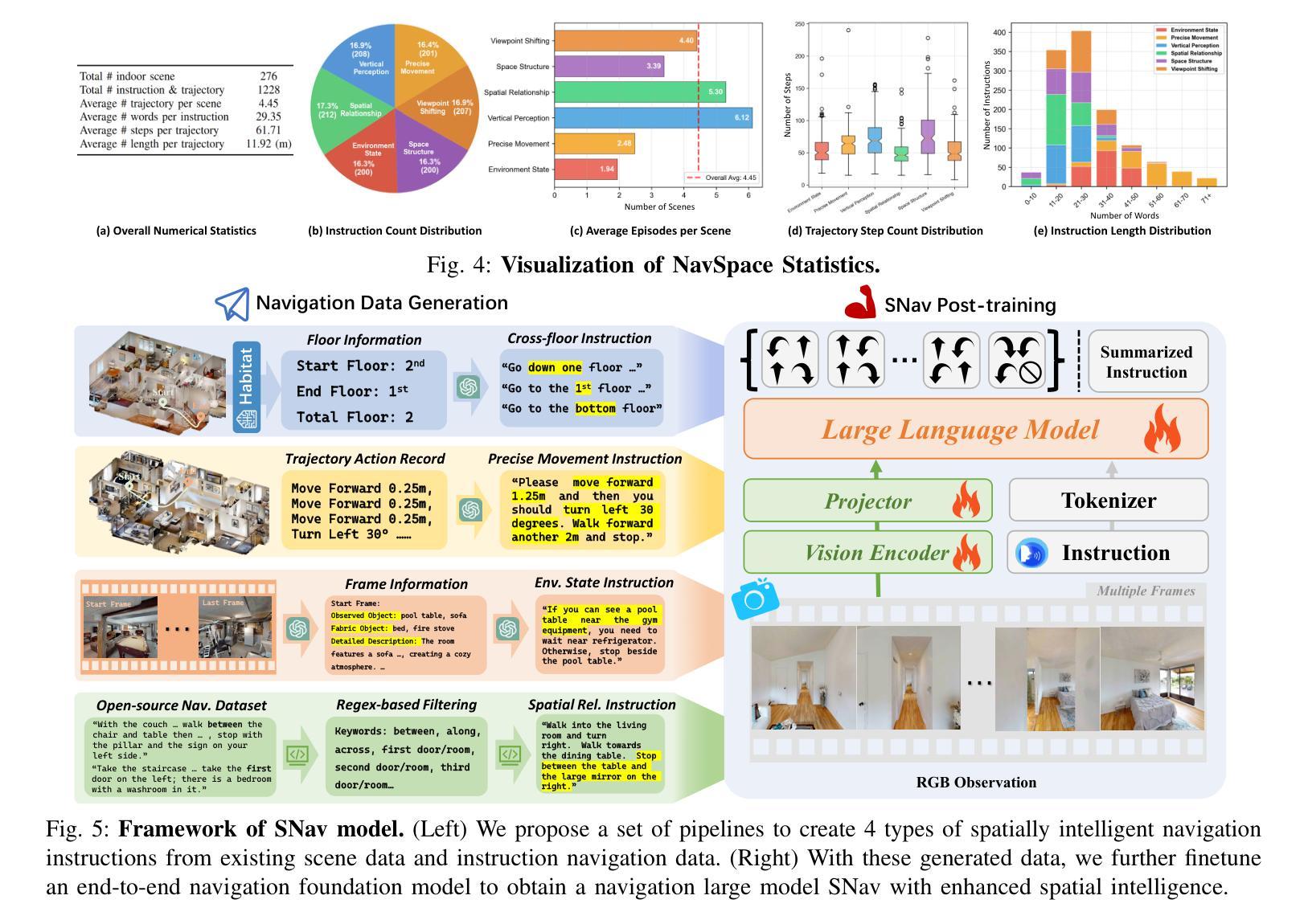 指令跟随导航是实现实体智能的关键步骤。此前的基准测试主要关注语义理解,但忽视了系统地评估导航代理的空间感知和推理能力。在这项工作中,我们引入了NavSpace基准测试,其中包含六个任务类别和1228个轨迹指令对,旨在探测导航代理的空间智能。在此基准测试上,我们全面评估了22个导航代理,包括最先进的导航模型和多模态大型语言模型。评估结果揭示了实体导航中的空间智能。此外,我们提出了一个新的空间智能导航模型SNav。SNav在NavSpace和真实机器人测试中都超越了现有导航代理,为未来的工作建立了强大的基准。
