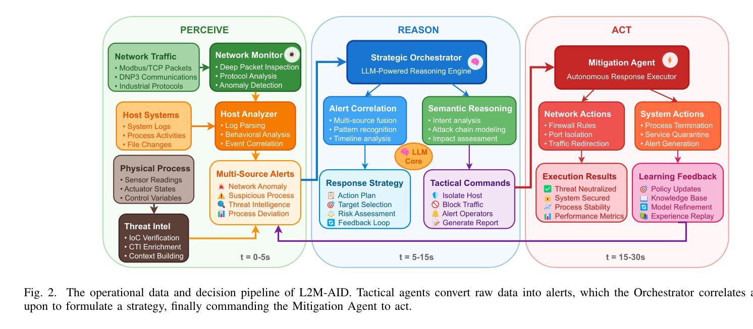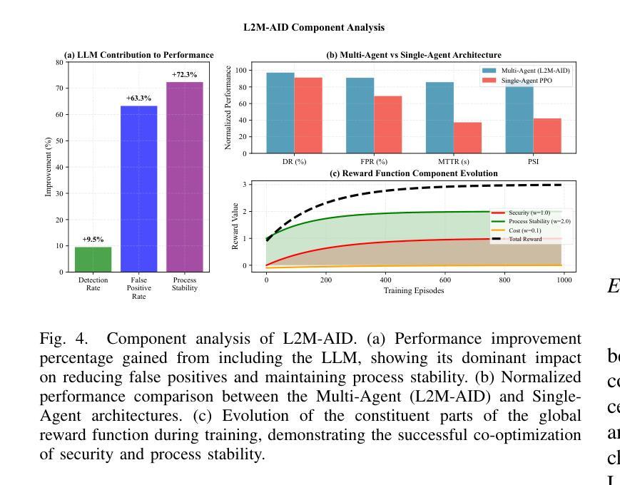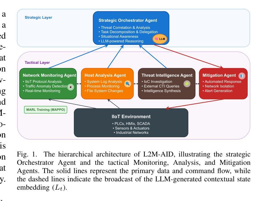 Summary:随着工业物联网(IIoT)的集成度不断提高,关键的网络物理系统面临复杂的多阶段攻击威胁,传统缺乏上下文意识的防御手段已不足以应对。本文提出了基于大型语言模型赋能的多智能体强化学习的自主工业防御框架L2M-AID。L2M-AID协调智能体团队进行自适应和弹性安全防御。其核心创新在于两种人工智能范式的深度融合:利用大型语言模型作为语义桥梁,将大量非结构化遥测信息转化为丰富的上下文状态表示,使智能体能够推断敌方意图而不仅仅是匹配模式。基于这种语义感知状态,我们利用多智能体强化学习算法MAPPO学习复杂的合作策略。实验结果表明,在关键指标上,L2M-AID显著优于传统入侵检测系统、深度学习异常检测器和单智能体强化学习基线,实现了高达97.2%的检测率,同时减少了超过80%的误报并加快了四倍的响应时间。在维护物理过程稳定性方面表现优异,为关键国家基础设施的安全保护提供了稳健的新范式。
