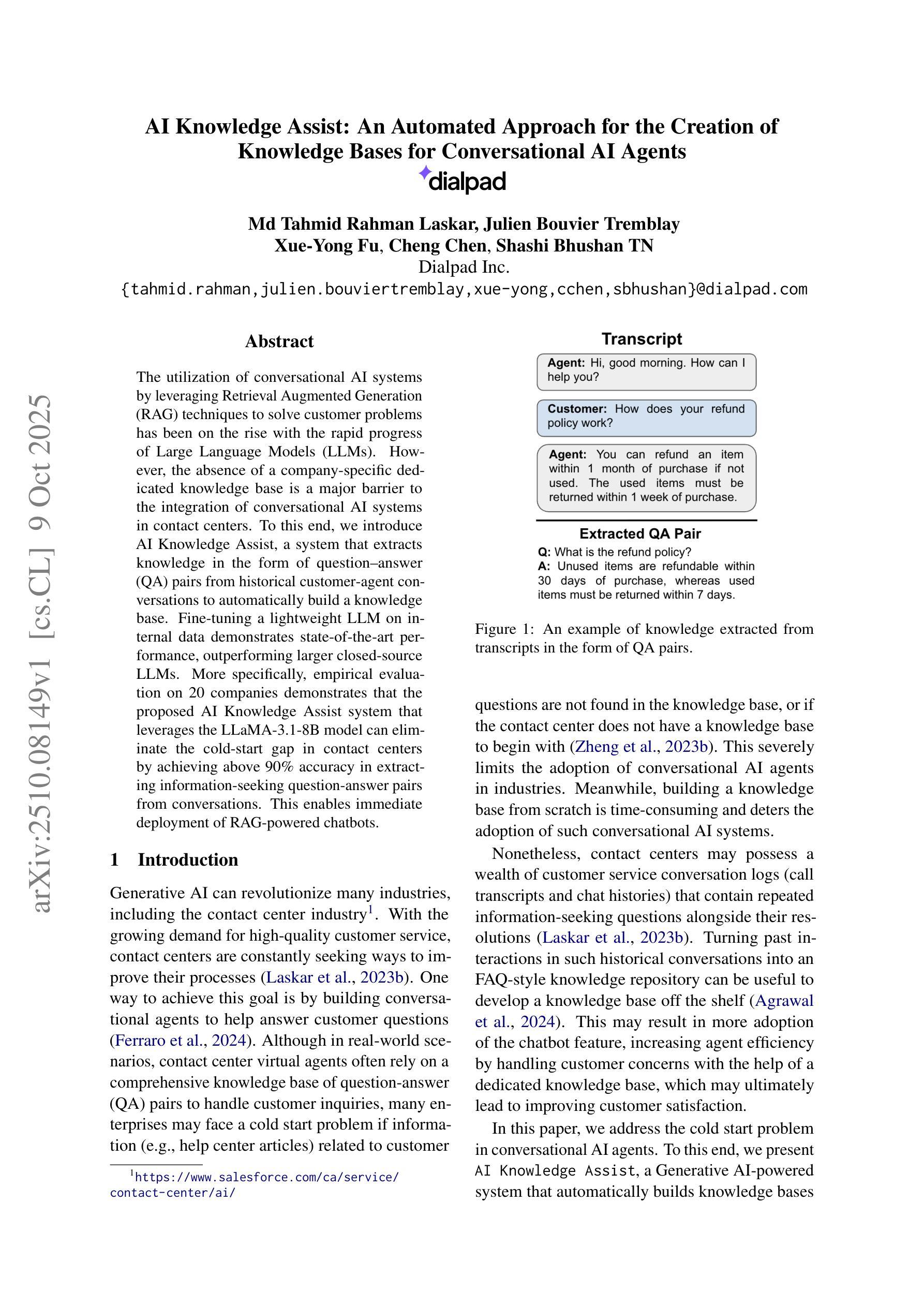 随着大型语言模型(LLM)的快速发展,利用检索增强生成(RAG)技术解决客户问题的对话式人工智能系统的应用正在增加。然而,缺乏针对公司的专用知识库是阻碍对话式人工智能系统在呼叫中心中整合的主要障碍。为此,我们引入了AI知识助手系统,该系统从历史和客服对话中提取以问答对的形式的知识来自动构建知识库。在内部数据上对轻量级LLM进行微调,表现出卓越的性能,超过了较大的闭源LLM。更具体地说,对20家公司的实证评估表明,所提出的利用LLaMA-3.1-8B模型的AI知识助手系统通过实现高达90%的信息查询问题回答准确率,消除了呼叫中心中的冷启动差距。这能够实现RAG驱动的聊天机器人的即时部署。
