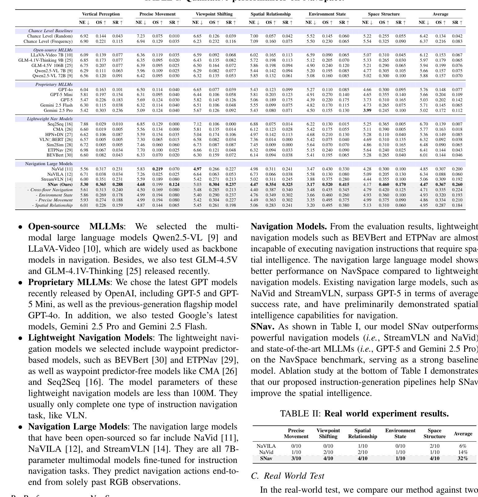 - 新型空间智能导航模型SNav在NavSpace基准测试和真实机器人测试中表现优异。