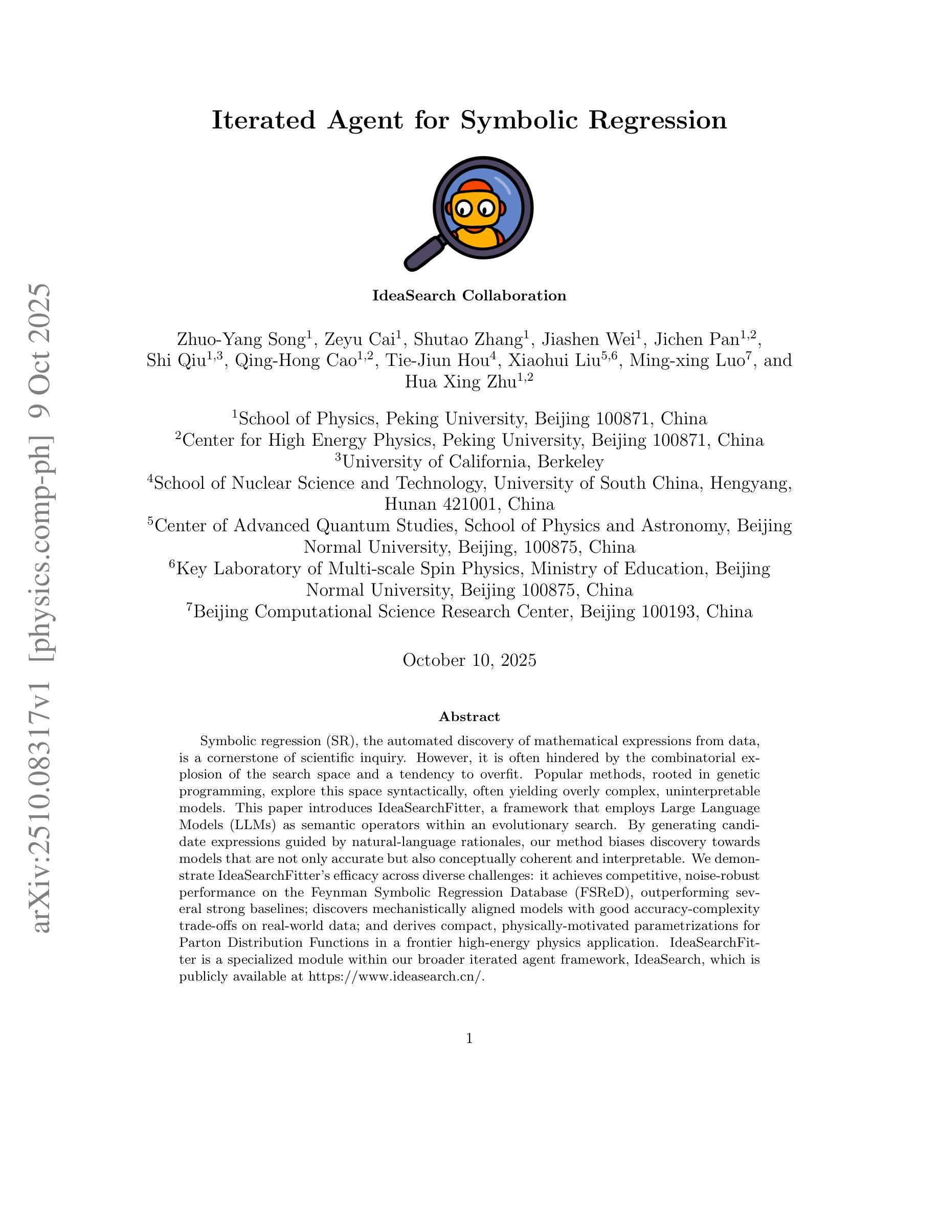 Symbolic regression (SR), the automated discovery of mathematical expressions from data, is a cornerstone of scientific inquiry. However, it is often hindered by the combinatorial explosion of the search space and a tendency to overfit. Popular methods, rooted in genetic programming, explore this space syntactically, often yielding overly complex, uninterpretable models. This paper introduces IdeaSearchFitter, a framework that employs Large Language Models (LLMs) as semantic operators within an evolutionary search. By generating candidate expressions guided by natural-language rationales, our method biases discovery towards models that are not only accurate but also conceptually coherent and interpretable. We demonstrate IdeaSearchFitter’s efficacy across diverse challenges: it achieves competitive, noise-robust performance on the Feynman Symbolic Regression Database (FSReD), outperforming several strong baselines; discovers mechanistically aligned models with good accuracy-complexity trade-offs on real-world data; and derives compact, physically-motivated parametrizations for Parton Distribution Functions in a frontier high-energy physics application. IdeaSearchFitter is a specialized module within our broader iterated agent framework, IdeaSearch, which is publicly available at https://www.ideasearch.cn/.