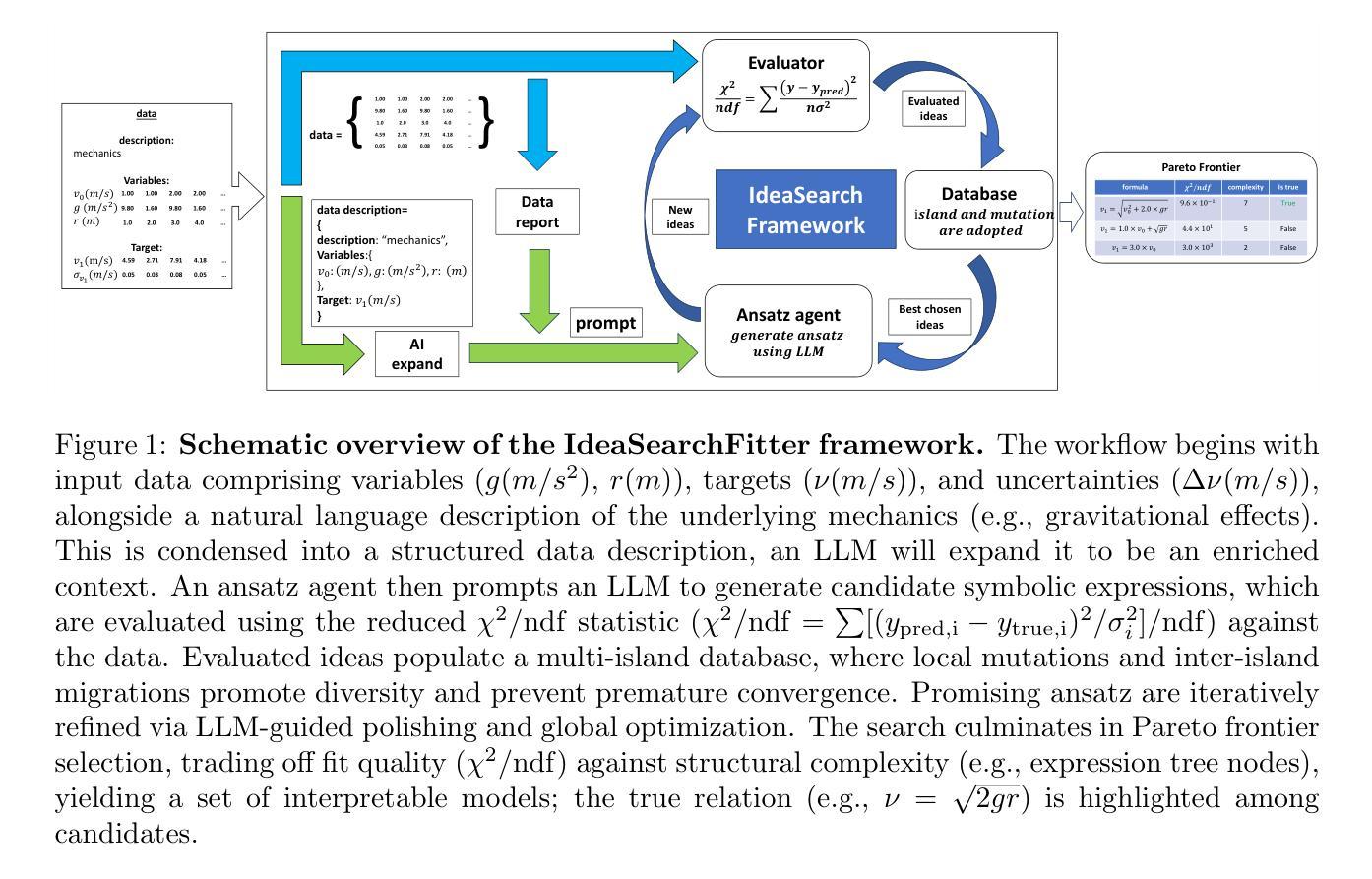 数据驱动的数学表达式自动发现方法——符号回归(SR)是科学探索的重要工具,但面临搜索空间组合爆炸和过度拟合等问题。本文提出IdeaSearchFitter框架,利用大型语言模型(LLMs)在进化搜索中作为语义操作符,生成受自然语言启发候选表达式,使发现模型既准确又概念连贯、可解释性强。IdeaSearchFitter在不同挑战中表现优异,包括在Feynman符号回归数据库(FSReD)上实现与强大基线相当的稳健性能;在现实世界数据上发现具有良好精度复杂度的机械对齐模型;并在高能物理应用的前沿领域推导出紧凑的物理参数化函数。
