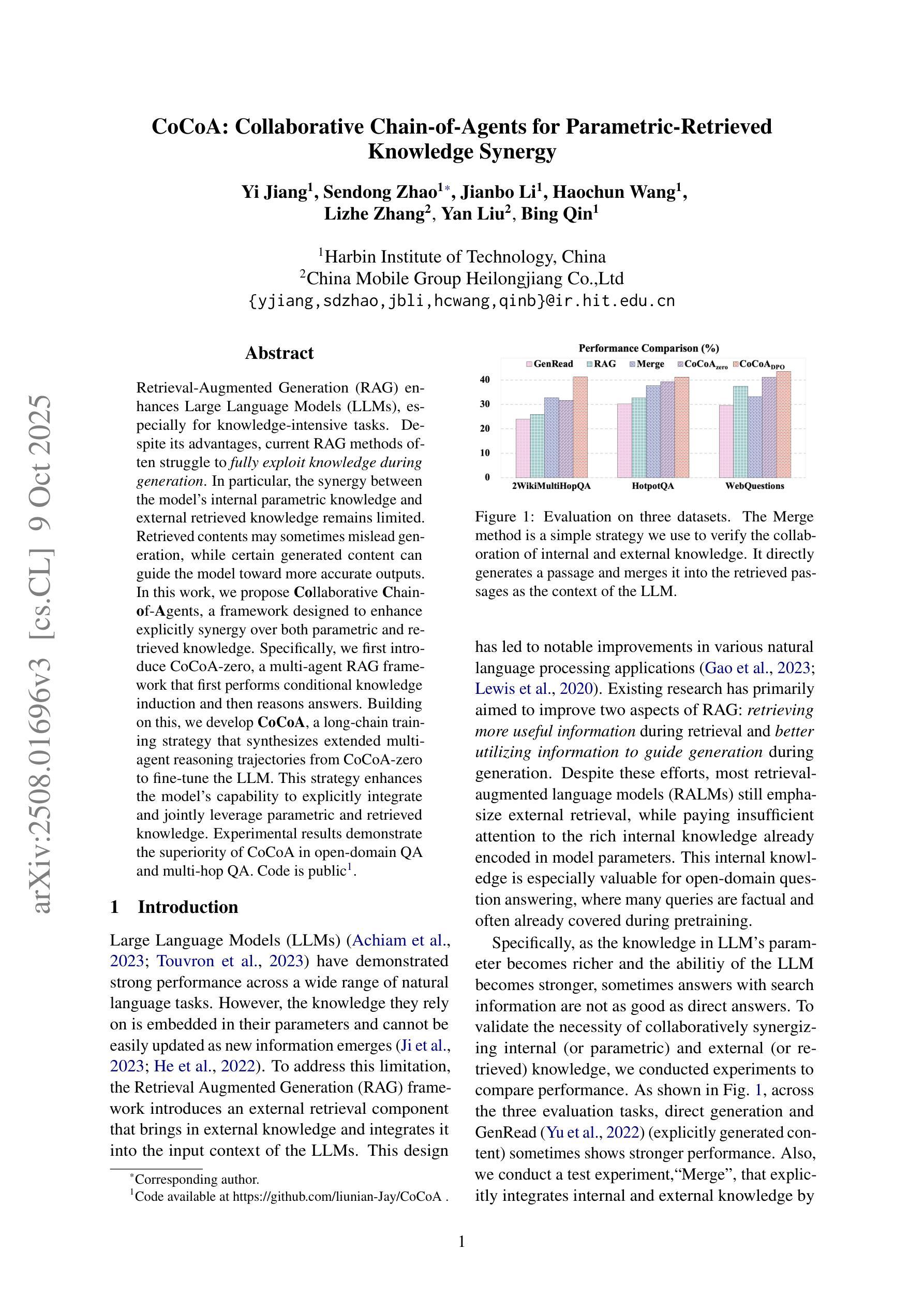 检索增强生成(RAG)技术提高了大型语言模型(LLM)的性能,特别是对于知识密集型任务。尽管具有优势,但当前的RAG方法往往难以在生成过程中充分利用知识。特别是,模型内部的参数知识与外部检索知识之间的协同作用仍然有限。检索的内容有时会误导生成,而某些生成的内容可以引导模型走向更准确的输出。在这项工作中,我们提出了协作代理链(Collaborative Chain-of-Agents)框架,该框架旨在增强参数知识和检索知识之间的明确协同。具体来说,我们首先引入了CoCoA-zero多代理RAG框架,先进行条件知识归纳,然后推理答案。在此基础上,我们开发了CoCoA长期训练策略,该策略通过合成来自CoCoA-zero的扩展多代理推理轨迹来微调LLM。这一策略提高了模型显式集成和联合利用参数知识和检索知识的能力。实验结果表明,CoCoA在开放域问答和多跳问答方面的优越性。