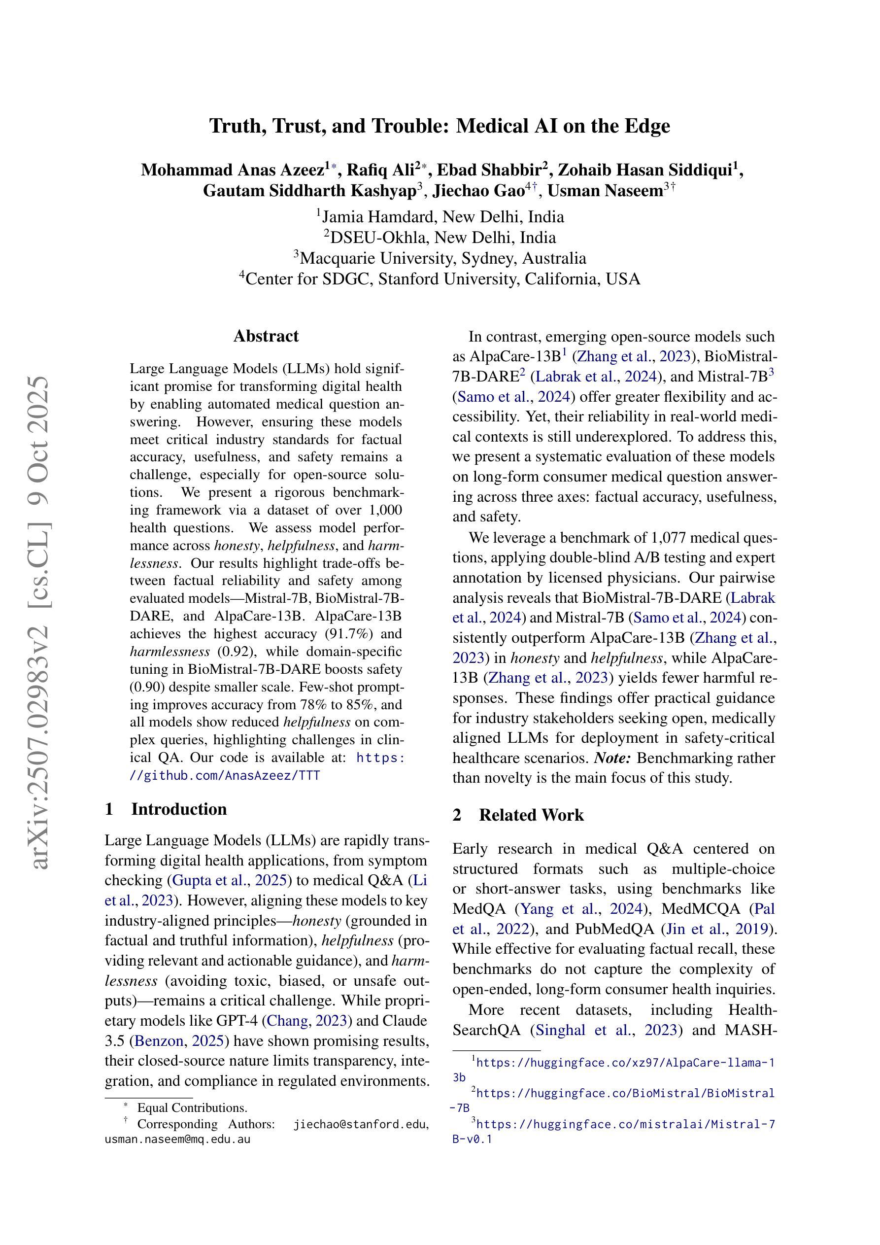 大型语言模型(LLMs)在通过实现自动化医疗问题回答来转变数字健康方面有着巨大的潜力。然而,确保这些模型达到行业关键的准确性、实用性和安全性的标准仍然是一个挑战,尤其是对于开源解决方案。我们利用包含超过1000个健康问题的数据集,提出了一个严格的基准测试框架。我们评估了模型在诚实度、实用性和无害性方面的表现。我们的结果突出了所评估模型在事实可靠性和安全性之间的权衡——Mistral-7B、BioMistral-7B-DARE和AlpaCare-13B。AlpaCare-13B的准确度最高(91.7%),且无害性也较高(0.92),而BioMistral-7B-DARE的专业领域调整虽然规模较小,但也能提高安全性(0.90)。提示性提示可将准确度从78%提高到85%,所有模型在处理复杂查询时的实用性都有所下降,这突显了临床问答中的持续挑战。