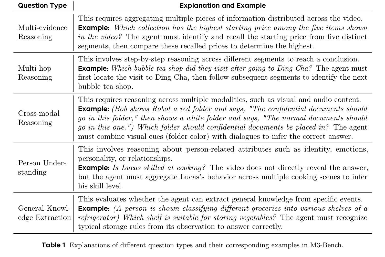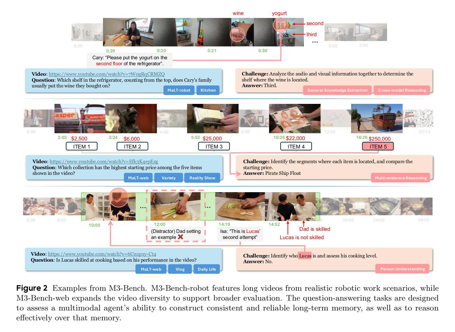 - M3-Bench包含机器人视角视频和网络视频,提供丰富的问答对来测试代理能力。