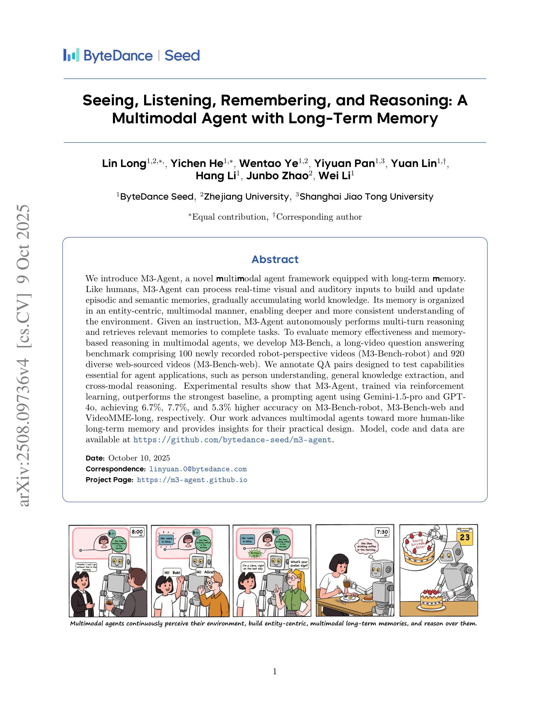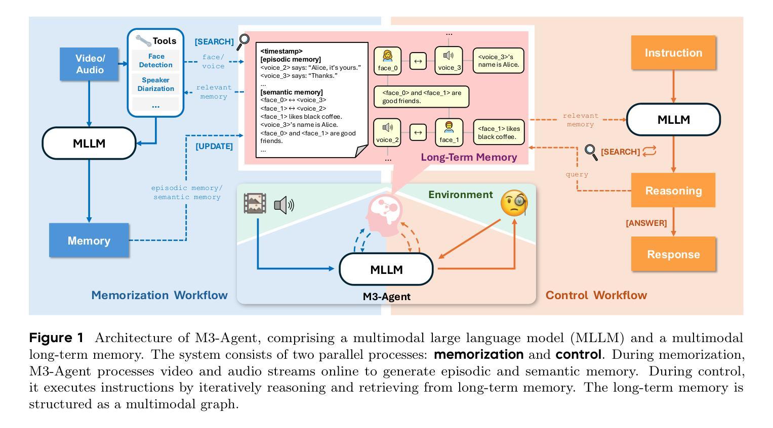 我们介绍了M3-Agent,这是一个配备长期记忆的新型多模态代理框架。与人类类似,M3-Agent能够处理实时视觉和听觉输入,以构建和更新情景记忆和语义记忆,逐渐积累世界知识。它的记忆以实体为中心,多模态的方式组织,使对环境有更深入、更一致的理解。给定指令后,M3-Agent能够自主进行多轮推理并检索相关记忆以完成任务。为了评估多模态代理中的记忆效果和基于记忆推理的能力,我们开发了M3-Bench,这是一个长视频问答基准测试,包括100个新录制的机器人视角视频(M3-Bench-robot)和920个多样化的网络视频(M3-Bench-web)。我们标注了QA对,旨在测试对于代理应用程序至关重要的能力,如人物理解、通用知识提取和跨模态推理。实验结果表明,通过强化学习训练的M3-Agent超越了最强的基线代理——使用Gemini-1.5-pro和GPT-4o的提示代理,在M3-Bench-robot、M3-Bench-web和VideoMME-long上的准确率分别提高了6.7%、7.7%和5.3%。我们的工作推动了多模态代理朝着更类似于人类的长程记忆方向发展,并为其实践设计提供了见解。模型、代码和数据可在https://github.com/bytedance-seed/m3-agent获取。