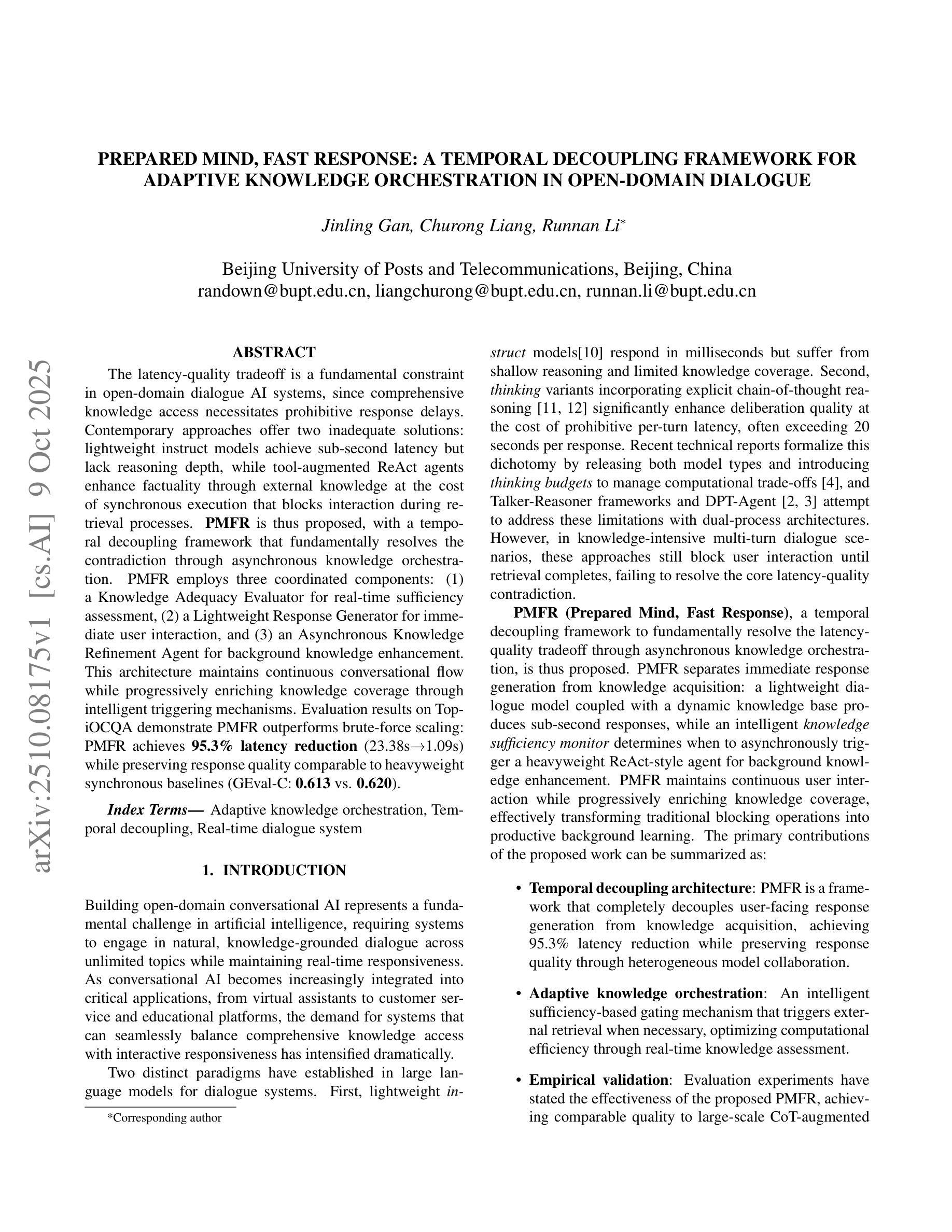 延迟与质量的权衡是开放领域对话AI系统中的一个基本约束,因为全面的知识访问会导致响应延迟。当前的方法提供了两种不充分的解决方案:轻量级指令模型实现了秒级延迟,但缺乏深度推理;工具增强的ReAct代理通过外部知识提高了事实准确性,但以同步执行为代价在检索过程中阻塞了交互。因此,提出了PMFR,它采用时间解耦框架,通过异步知识编排从根本上解决了矛盾。PMFR采用三个协调组件:(1)知识充足性评估器,用于实时充足性评估;(2)轻量级响应生成器,用于即时用户交互;(3)异步知识优化代理,用于后台知识增强。该架构通过智能触发机制保持连续的对话流程,同时逐步丰富知识覆盖。在TopiOCQA上的评估结果表明,PMFR优于暴力扩展:PMFR实现了95.3%的延迟降低(从23.38秒到1.09秒),同时保持与重量级同步基准相当的反应质量(GEval-C:0.613对0.620)。