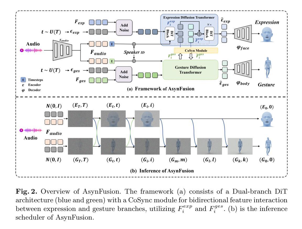 全身音频驱动的角色姿态和表情生成是创建逼真数字人和增强交互式虚拟代理人能力的一项关键任务,在虚拟现实、数字娱乐和远程通信等领域有广泛应用。现有方法通常独立生成音频驱动的面部表情和动作,这引入了一个重要的局限性:面部表情和动作元素之间缺乏无缝协调,导致动画效果不够自然和连贯。为了解决这一局限性,我们提出了AsynFusion,这是一个利用扩散变压器实现和谐表情和动作合成的新框架。该方法建立在双分支DiT架构之上,能够实现面部表情和动作的并行生成。在模型中,我们引入了一个合作同步模块,以促进两种模式之间的双向特征交互,以及一种异步LCM采样策略,以减少计算开销同时保持高质量输出。大量实验表明,AsynFusion在生成实时同步全身动画方面达到了最新技术水平,在定量和定性评估中均优于现有方法。