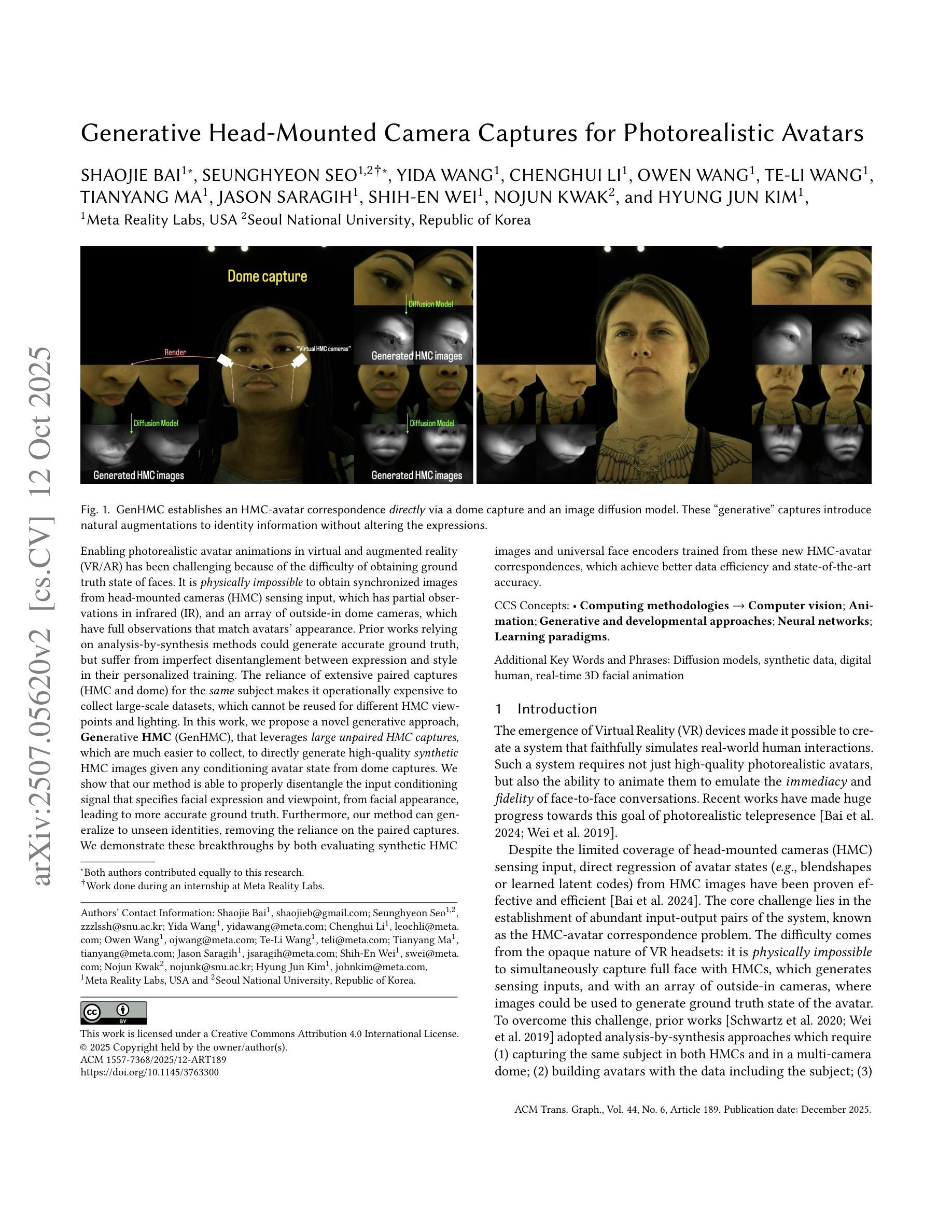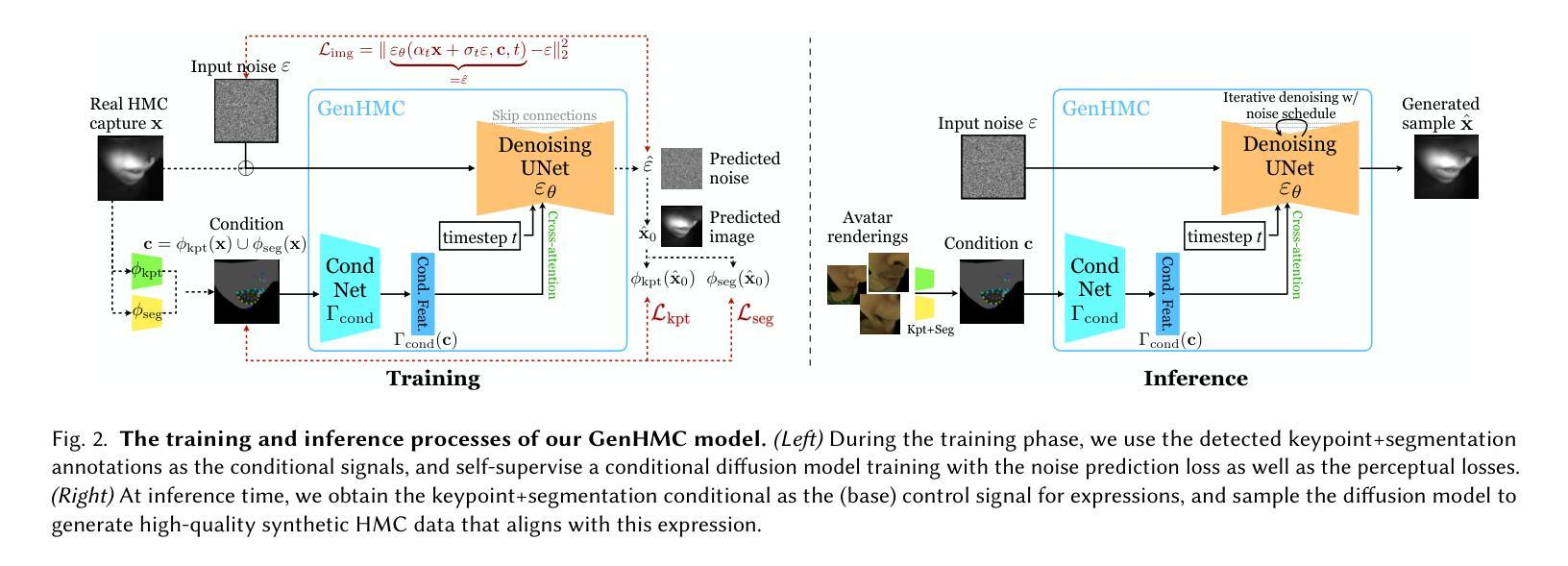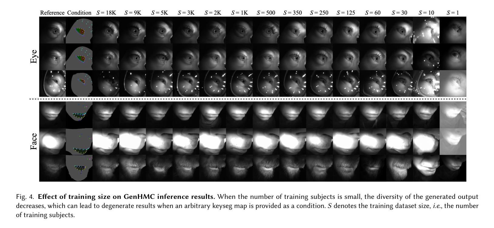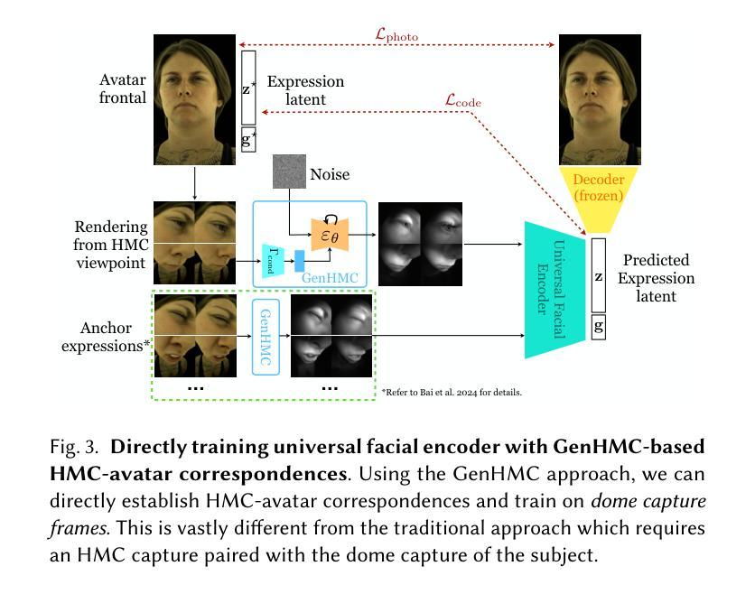 本文提出了一种新型生成方法——生成式HMC(GenHMC),该方法利用大量未配对的HMC捕捉数据,直接生成高质量合成HMC图像,给定任何条件化avatar状态。此方法能够准确地将面部表情和视角的输入条件信号与面部外观分离,生成更准确的地面真实数据。此外,该方法可推广至未见过的身份,无需配对捕捉。通过评估合成HMC图像和基于新HMC-avatar对应关系的通用面部编码器,展现了该方法在数据效率和准确性方面的优越性。