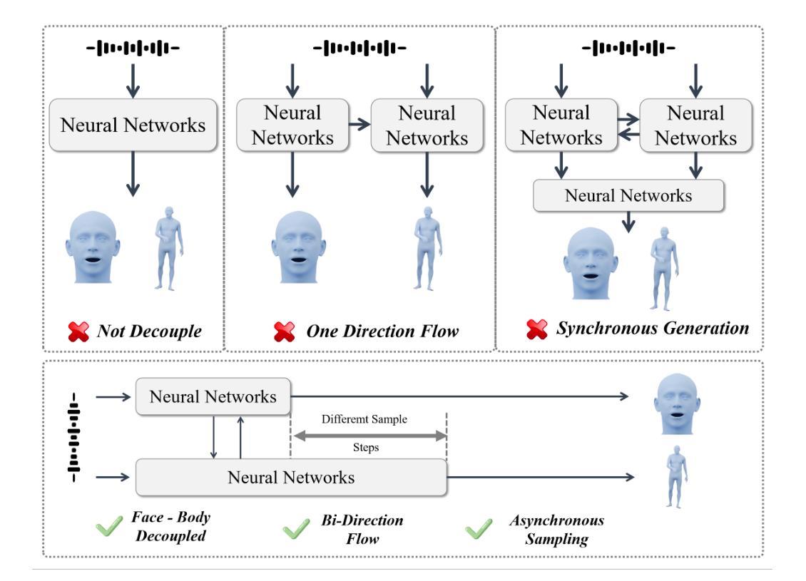 - 现有方法独立生成音频驱动的面部表情和动作,导致两者缺乏协调。