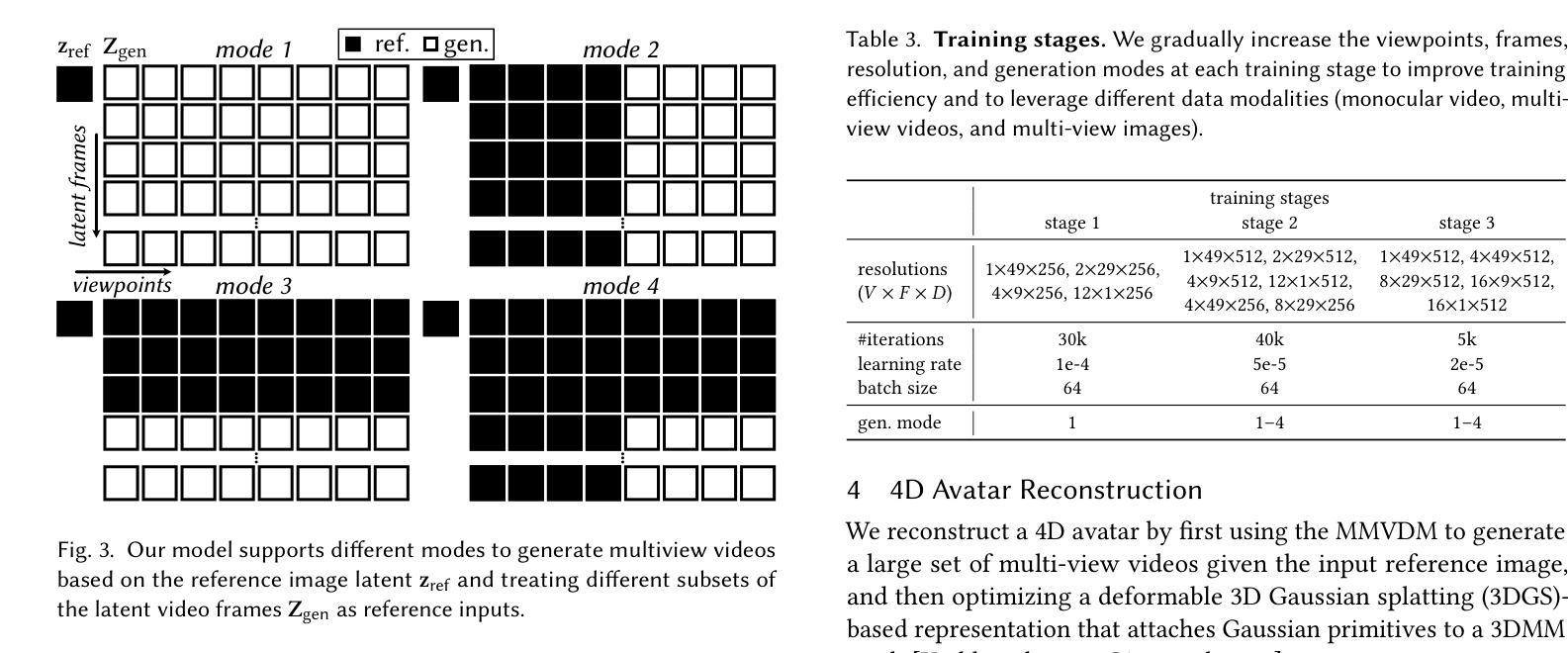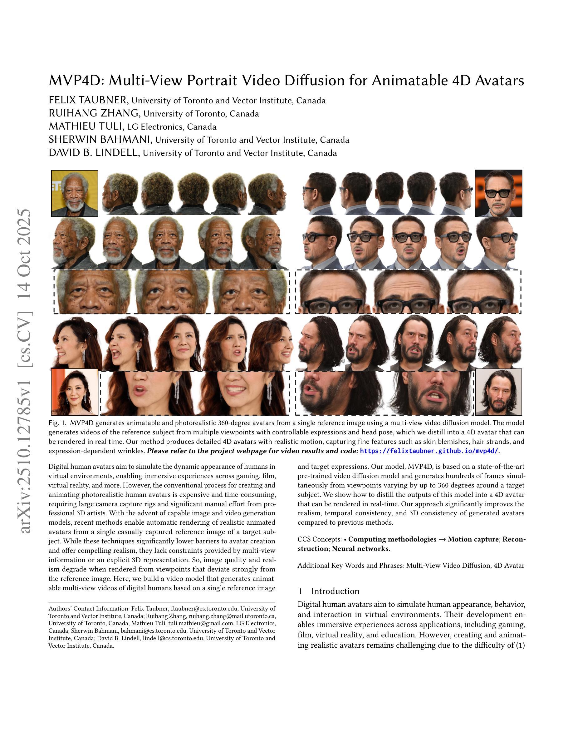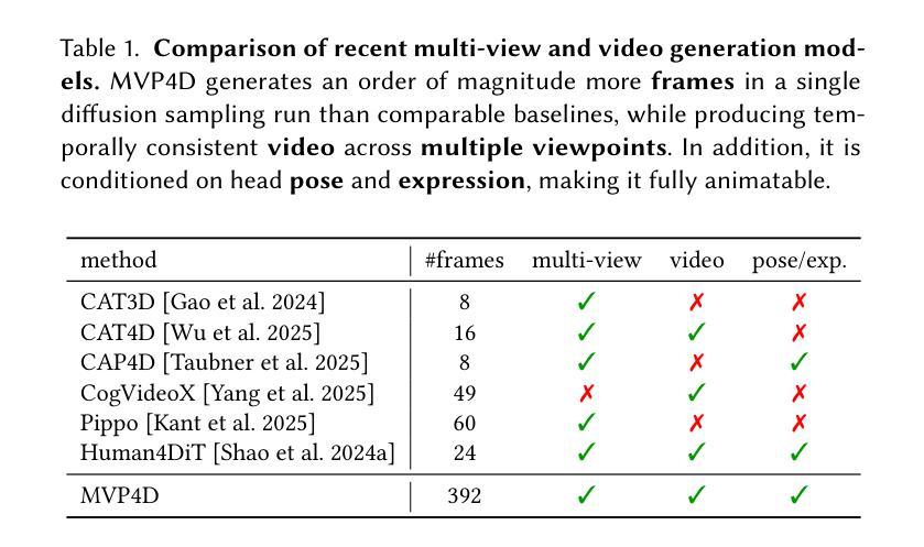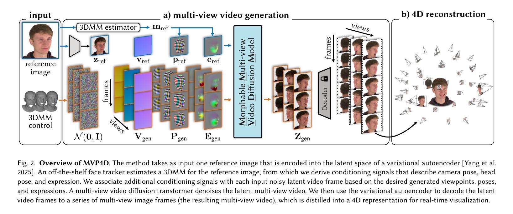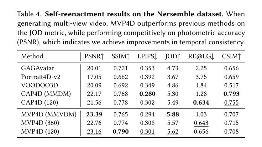 数字人类化身旨在模拟虚拟环境中人类的动态外观,为游戏、电影、虚拟现实等领域提供沉浸式体验。然而,创建和驱动逼真人类化身的传统过程既昂贵又耗时,需要大型相机捕捉设备和专业3D艺术家的大量手动工作。随着强大的图像和视频生成模型的出现,最近的方法能够从单个随意捕获的目标对象参考图像自动渲染逼真的动画化身。虽然这些技术大大降低了创建化身的障碍并提供了引人注目的逼真效果,但它们缺乏多视图信息或明确的3D表示所提供的约束。因此,当从与参考图像偏离较大的视角进行渲染时,图像质量和逼真度会降低。在这里,我们建立了一个基于单个参考图像和目标表情生成数字人类多角度视频的视频模型。我们的模型MVP4D基于最先进的预训练视频扩散模型,可以同时从目标对象周围最多360度的视角生成数百帧。我们展示了如何将该模型的输出提炼成可以在实时渲染的4D化身。与以前的方法相比,我们的方法显著提高了生成的化身在逼真度、时间一致性和3D一致性方面的表现。