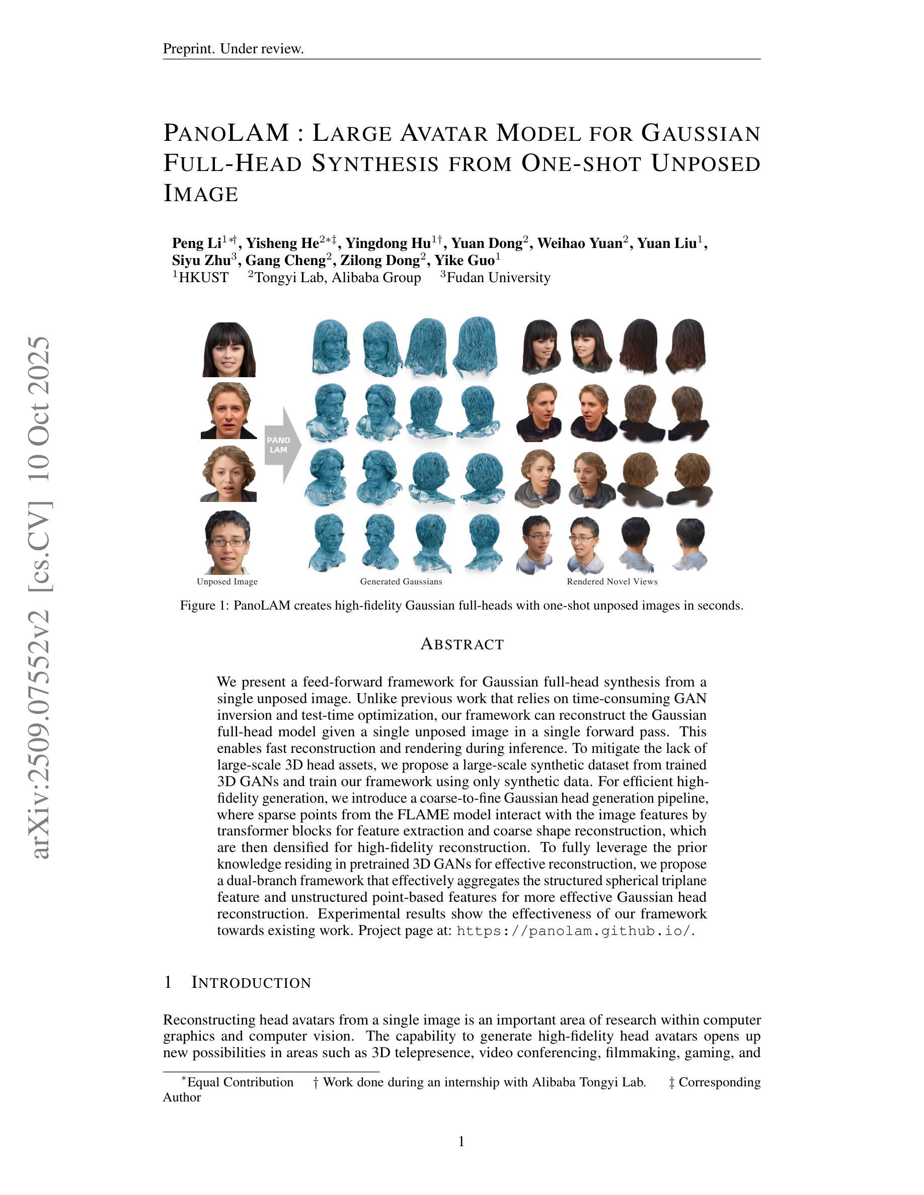 我们提出了一种基于单一未姿态图像的高斯全头合成前馈框架。不同于之前依赖于耗时性的GAN反演和测试时优化的工作,我们的框架能够在单次前向传递中根据单一的未姿态图像重建高斯全头模型。这可以在推理过程中实现快速重建和渲染。为了缓解大规模三维头部资产缺乏的问题,我们从训练好的三维GAN中提出了大规模合成数据集,并且只使用合成数据来训练我们的框架。为了进行有效的精细高品质生成,我们引入了从粗到细的高斯头部生成管道,其中来自FLAME模型的稀疏点与图像特征通过变换器块进行特征提取和粗略形状重建,然后进行密集化以实现高保真重建。为了充分利用预训练三维GAN中的先验知识进行有效重建,我们提出了一个双分支框架,该框架可以有效地聚合结构化球面三角平面特征和非结构化点基特征,以进行更有效的高斯头部重建。实验结果证明我们的框架相比现有工作更有效。项目页面地址为:https://panolam.github.io/。